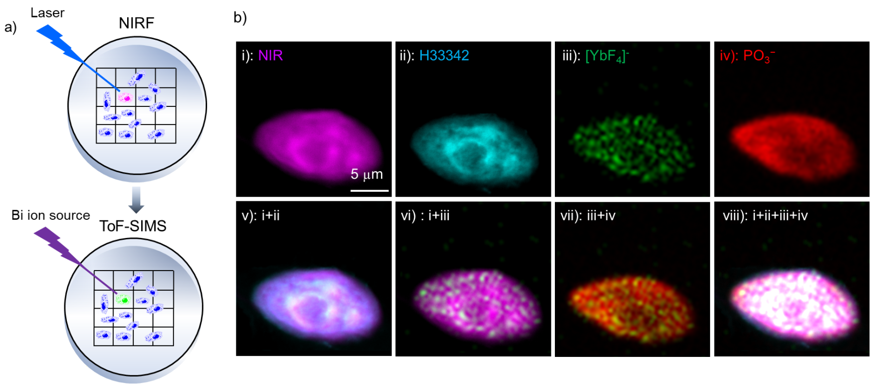 二次离子质谱 (SIMS),包括 NanoSIMS和ToF-SIMS,最近被广泛应用于植物、微生物和病理样品的分析与检测。然而生物大分子富含C、H、O、N等元素,缺乏特征片段或分子离子峰,SIMS应用于成像单细胞中特定生物大分子仍十分具有挑战性。相比而言,稀土元素的同位素选择范围广和在人体中自然丰度低等优点,在单细胞质谱成像领域具有独有的优势。因此,将该类稀土分子探针应用于细胞中DNA、RNA、蛋白质和聚糖的ToF-SIMS成像,实现NIR荧光成像和SIMS成像的结合,对细胞中新生DNA进行了双模态成像,展示了稀土在分子成像中的独特性。
