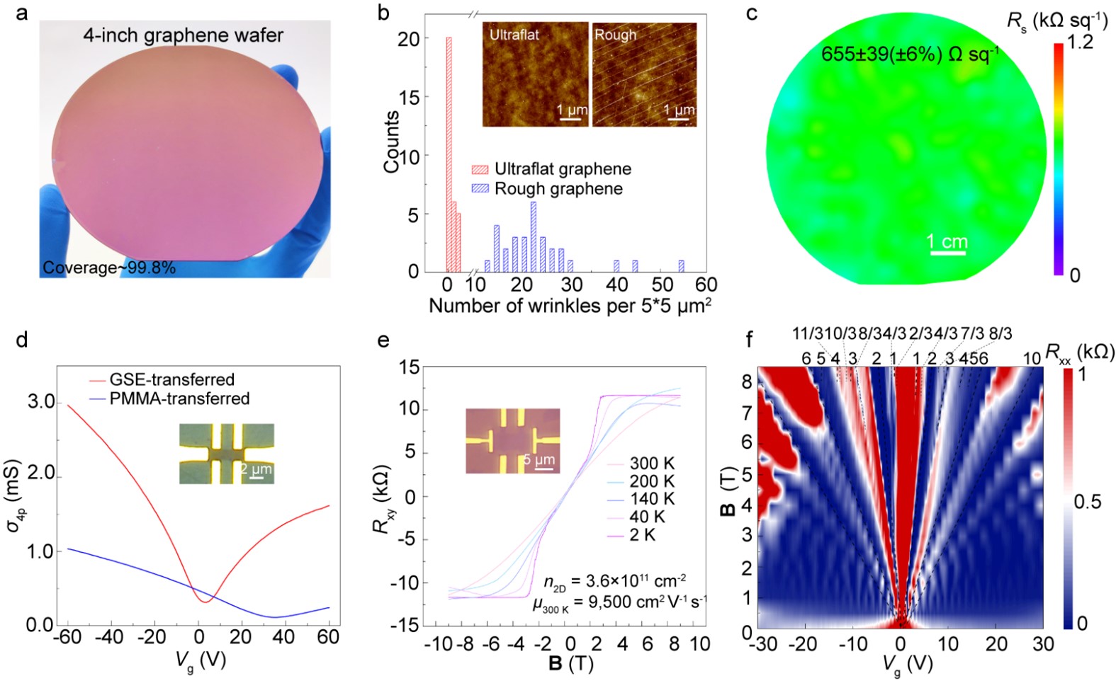 图2 梯度表面能调控转移的石墨烯晶圆。(a)无损转移到SiO2/Si衬底上高完整度4英寸石墨烯晶圆;(b)超平整石墨烯与粗糙石墨烯褶皱数目的对比(5×5 μm2范围内)及典型的原子力显微镜图片对比(内嵌图);(c)转移后4英寸石墨烯晶圆的面电阻;(d)梯度表面能调控与传统湿法转移的石墨烯的电学转移曲线对比;(e)转移到SiO2/Si上的石墨烯在不同温度下的霍尔曲线及室温量子霍尔效应;(f)转移后石墨烯(氮化硼封装,1.7 K)的朗道扇形图,表现出分数量子霍尔效应。