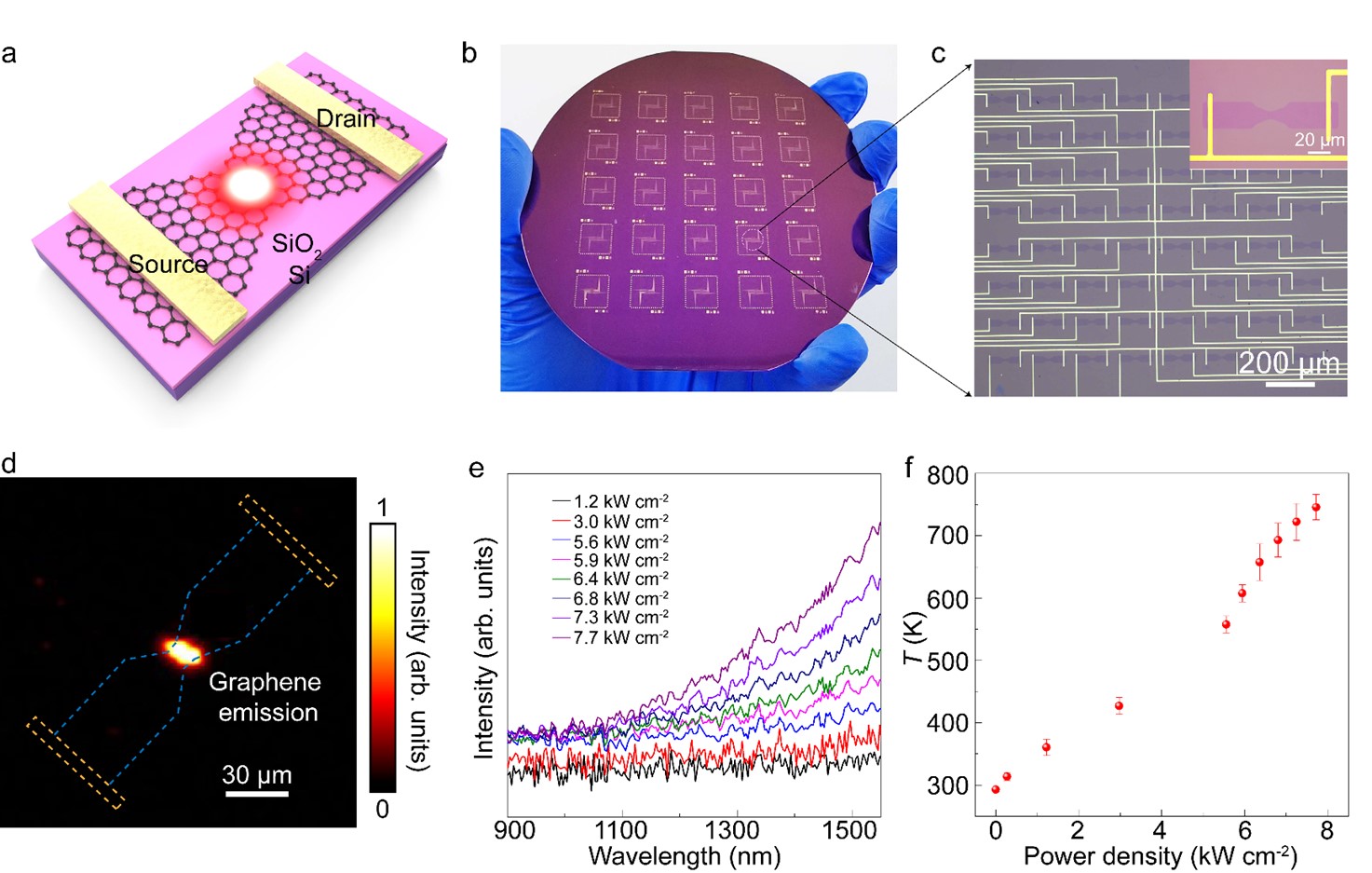 图3 晶圆级石墨烯热电子发光阵列器件。(a)石墨烯热电子发光示意图;(b)基于4英寸晶圆石墨烯的热电子发光阵列;(c)石墨烯热电子发光阵列的光学显微镜照片;(d)器件在电功率密度为3.0 kW/cm2时的红外照片;(e)器件在不同电功率密度下的辐射光谱;(f)石墨烯晶格温度随电功率密度的变化。