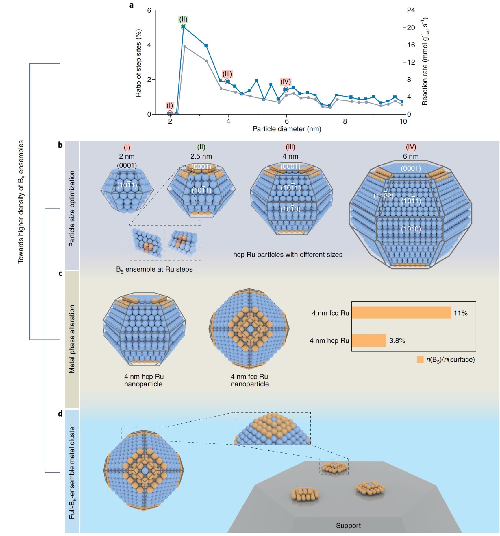 在确定目标化学键活化/催化反应所需的金属原子“集团”的基础上,通过提高催化剂表面的金属“集团”密度,可以进一步提升催化剂的质量活性(mass-specific activity),这是金属催化剂的设计的另一准则。以Ru 基合成氨催化剂为例,已被证实Ru金属B5-site是反应物N2吸附和活化的主要位点。可以通过如下策略改变B5-site密度:1). 可以通过改进催化剂尺寸来改变Ru纳米颗粒中的B5-site密度,当纳米颗粒尺寸在2-3 nm,其B5-site在颗粒全部金属中占比最高 (图2a, b); 2).可以通过改变金属物相来改变活性位密度:将Ru纳米颗粒的相态从六方相变成立方相,表面台阶位的比例增大,B5-site密度也相应升高(图2c)。3). 作者同时提出,下一步最大化B5-site密度的方法是将纳米颗粒表面由多个B5-site组成的原子簇“移植”到载体上(图2d),制成基本完全由B5-site组成的全暴露金属团簇(fully-exposed metal cluster);这样可以在将金属催化剂原子利用率提高到100%的基础上实现全高活性位点(在Ru基合成氨催化剂的例子中是全B5-site)构筑,因此是金属催化剂设计的最终目标。