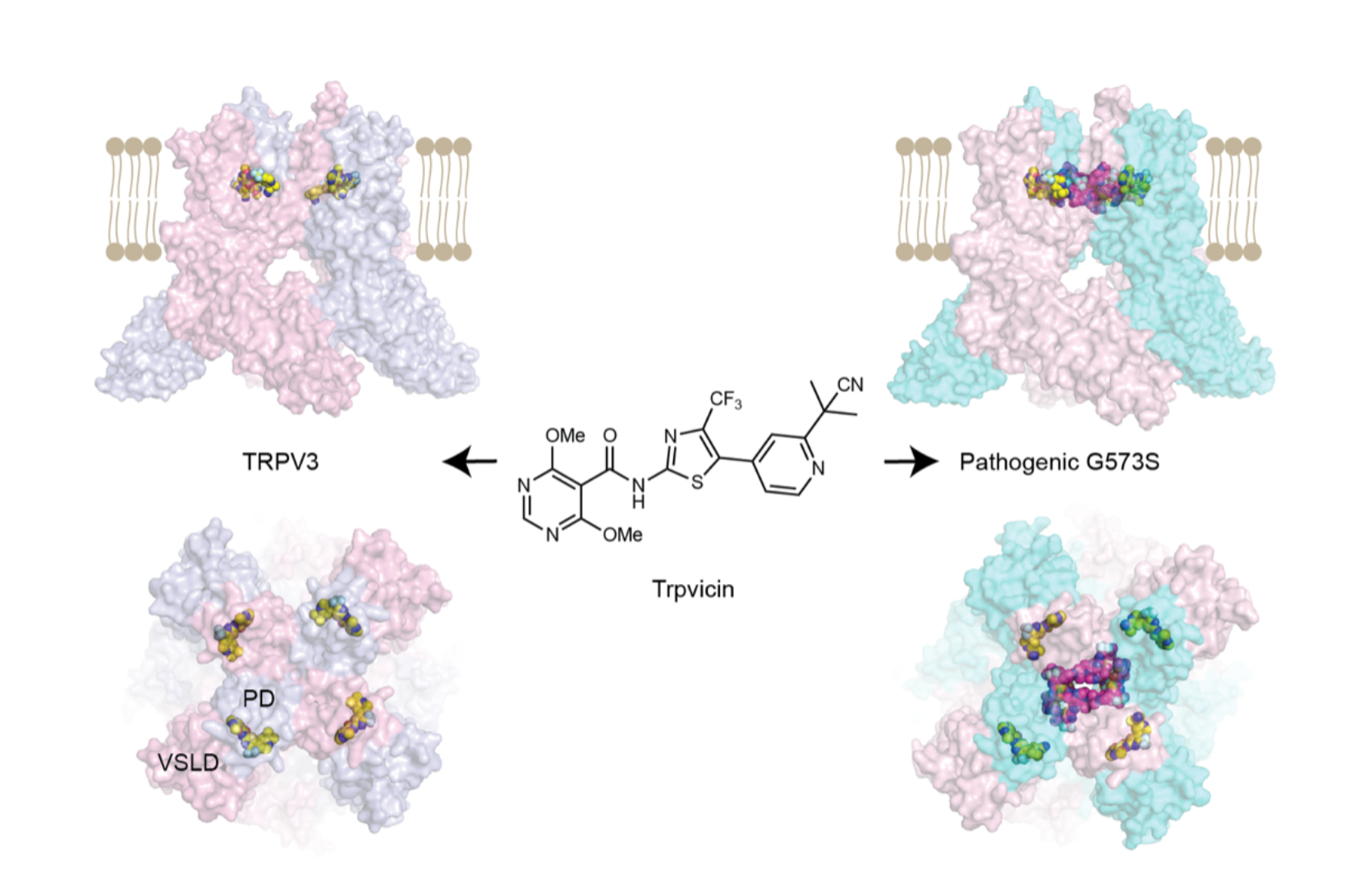 TRPV3是瞬时受体电位香草酸通道(TRP vanilloid,TRPV)家族的6个成员之一。与它同家族的辣椒素受体TRPV1相关研究,曾经斩获2021年诺贝尔生理学或医学奖。前期研究发现TRPV3 的功能障碍会导致多种皮肤病,例如Olmsted综合征(残毁性皮肤角化病),特应性皮炎(atopic dermatitis,AD)相关联的系统性瘙痒,以及脱发等。Olmsted综合征是一类罕见的皮肤病,病人可出现严重的皮肤角化和脱发,也是迄今为止发现的唯一一种伴有自发瘙痒的人类遗传病,是研究瘙痒的良好模型。此外AD是皮肤科疾病中病人群体最大的一种慢性炎症性疾病,皮疹会累及身体的大部分部位,伴有剧烈、持续的瘙痒,严重影响病人的生活质量。根据WHO数据,全球目前至少有2.5亿人受到AD的困扰。然而由于缺乏高亲和力和高选择性的TRPV3小分子抑制剂,TRPV3 作为潜在治疗靶点的研究受到了严重阻碍。