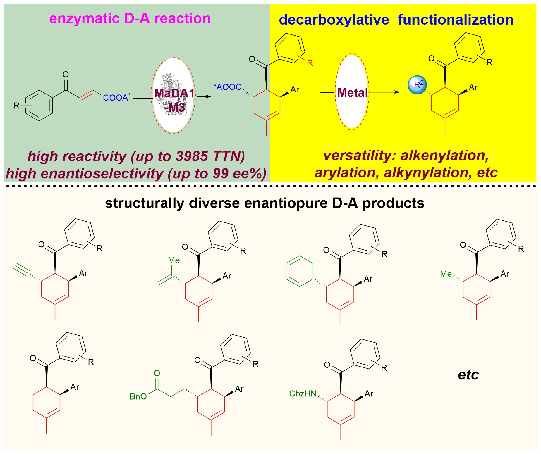 2022年11月16日,雷晓光课题组以“Diversity-oriented synthesis of cyclohexenes by combining enzymatic intermolecular Diels-Alder reactions and decarboxylative functionalizations”为题,在Chem Catalysis上报道了针对D-A酶MaDA1的蛋白工程改造,并通过将酶催化的D-A反应与金属催化脱羧官能团化反应巧妙结合,利用生物催化与化学催化相辅相成和优势互补的特点,实现了环己烯骨架的多样性导向、精准合成。该研究工作为结构多样的六元环骨架的合成提供了新的思路,拓展了酶催化的应用范围(图1)。