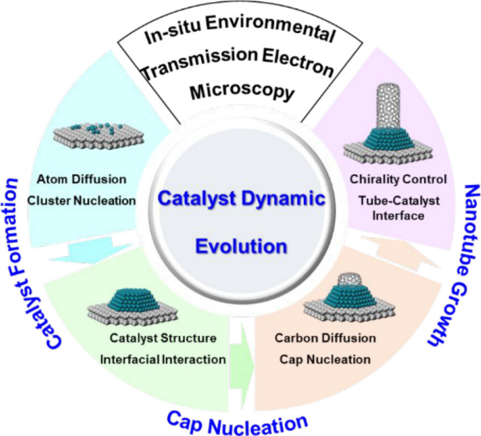 图1 原位ETEM表征催化剂动态演化和碳纳米管成核过程的示意图