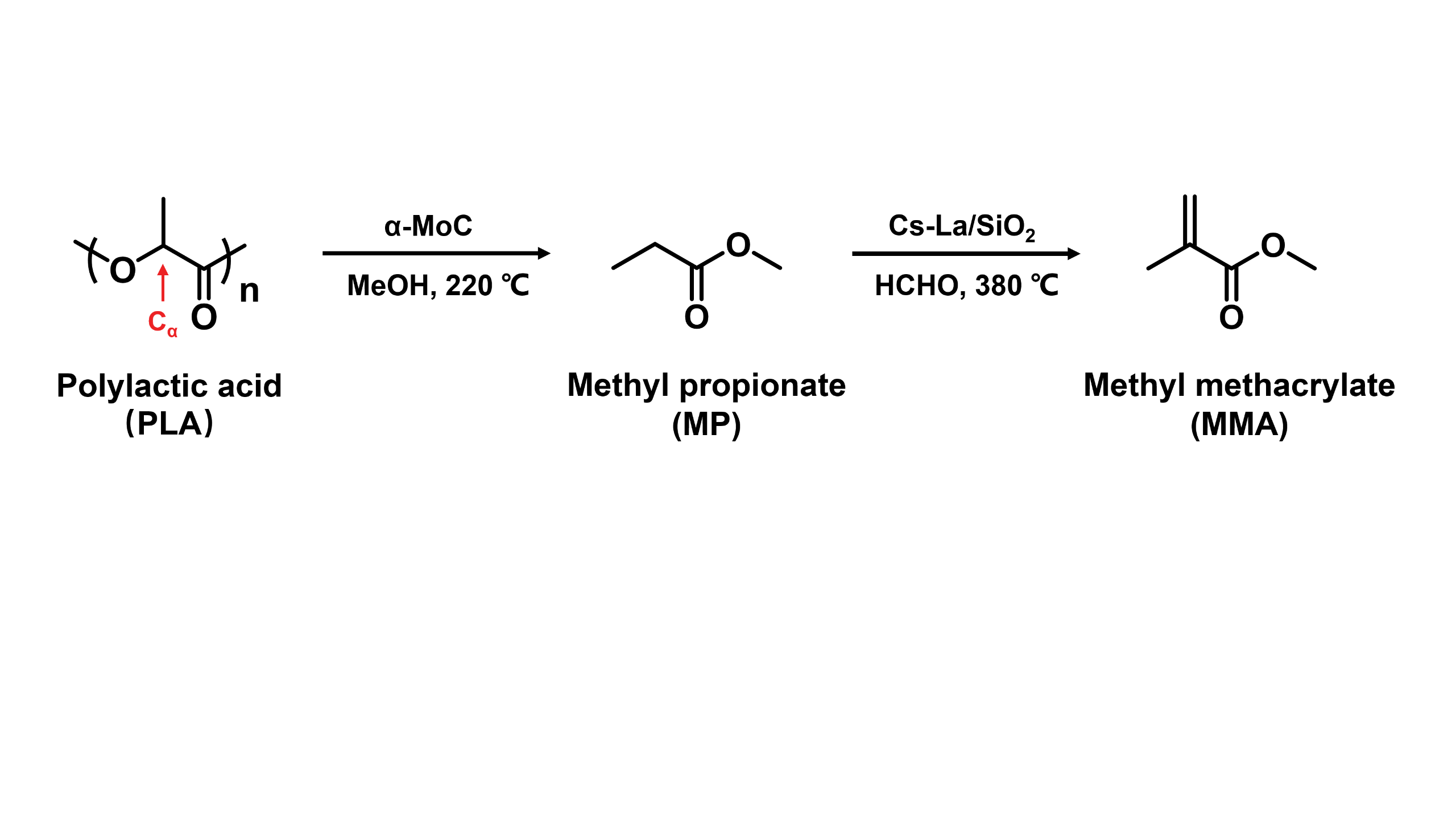 近日,北京大学马丁/王蒙课题组首次报道了一种通过两步催化反应将聚乳酸塑料转化为甲基丙烯酸甲酯的新过程(图1)。在第一步反应中采用α-MoC催化剂及甲醇,在无外加氢气的条件下(反应温度为220度),通过醇解和加氢脱氧过程实现聚乳酸废塑料高效制备丙酸甲酯(聚乳酸转化率> 99%,丙酸甲酯收率~98%)。这种加氢脱氧催化体系同时适用于聚乙醇酸(PGA)及聚己内酯(PCL)的催化降解。进一步采用Cs-La/SiO2催化剂,可以实现丙酸甲酯和甲醛向甲基丙烯酸甲酯的高效转化(图2a,反应温度为380度,丙酸甲酯转化率> 80%,甲基丙烯酸甲酯选择性> 90%)。使用商业聚乳酸吸管(约含83% PLA)评估了聚乳酸两步法转化为甲基丙烯酸甲酯的效率,6 g 聚乳酸吸管经过两步催化转化可获得2.5 g甲基丙烯酸甲酯和2.1 g丙酸甲酯(图2c),值得注意的是,整个反应过程中无需外加氢气。
