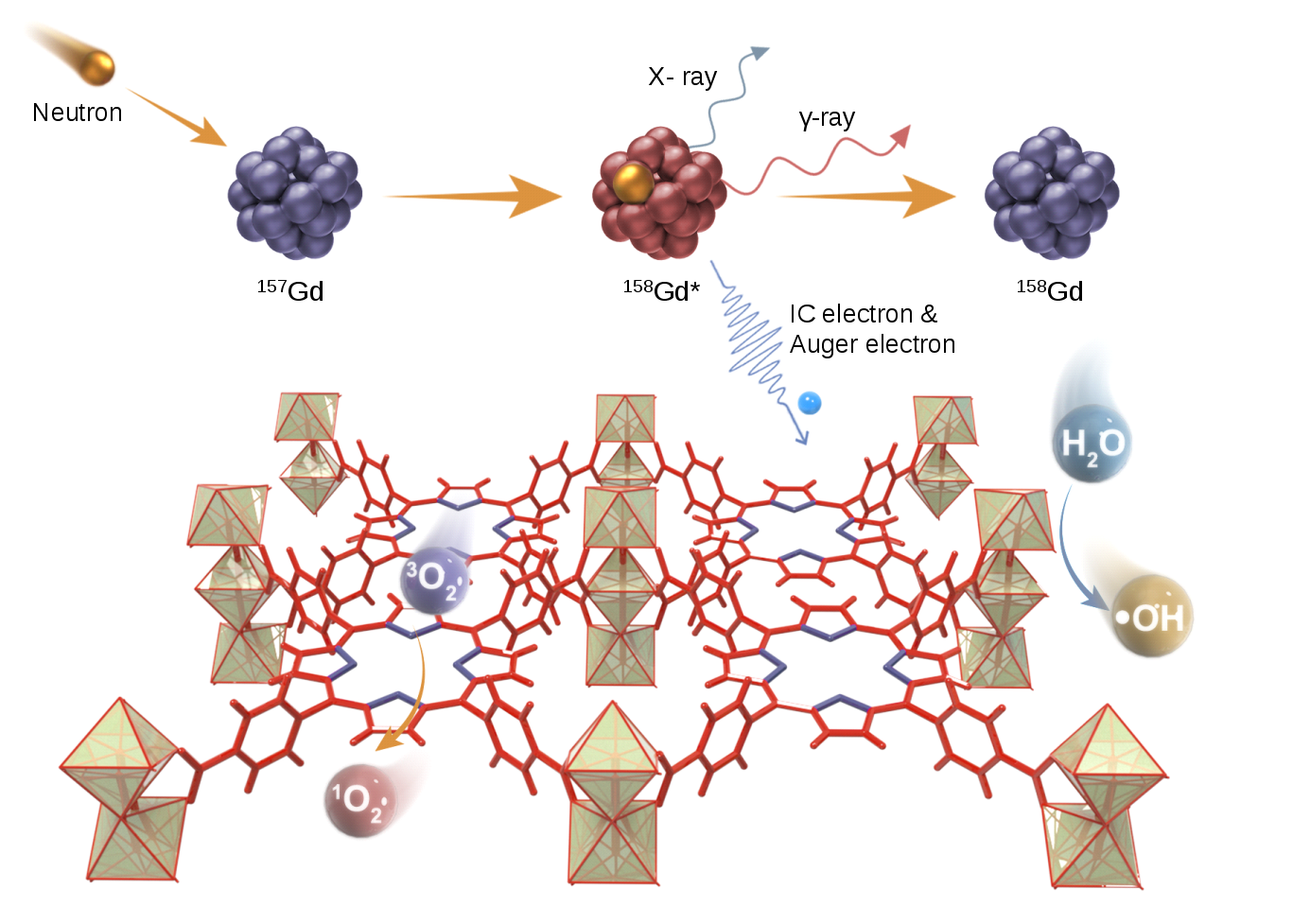 近日,北京大学化学与分子工程学院应用化学系刘志博课题组在CCS Chemistry上发表题为“Gadolinium Neutron Capture Reaction-Induced Nucleodynamic Therapy Potentiates Antitumor Immunity”的研究论文(DOI: 10.31635/ccschem.023.202202488)。该工作利用157Gd(n, γ)反应激发 MOFs材料,在肿瘤内原位产生·OH和1O2等活性氧物种,杀伤肿瘤细胞并激活全身肿瘤免疫,为中子俘获治疗和放疗增敏提供了新思路。