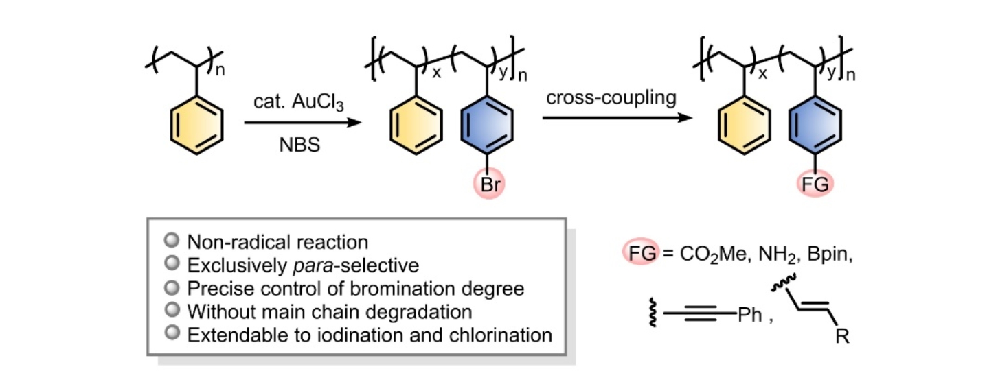 近日,北京大学化学与分子工程学院王剑波研究团队发展了一种高效的三氯化金催化的聚苯乙烯卤化的方法(Gold-Catalyzed Precise Bromination of Polystyrene. Bowen Dou, Yan Xu, Jianbo Wang, J. Am. Chem. Soc. 2023, 145, 10422-10430)。该方法除了能够保持聚苯乙烯链结构不变以及高度区域选择性地在苯环对位卤化之外,更为重要的特点是只需改变卤化剂的负载量即可精确控制卤化程度,从而能够以准确和可预测的方式调节官能团的密度(图1)。