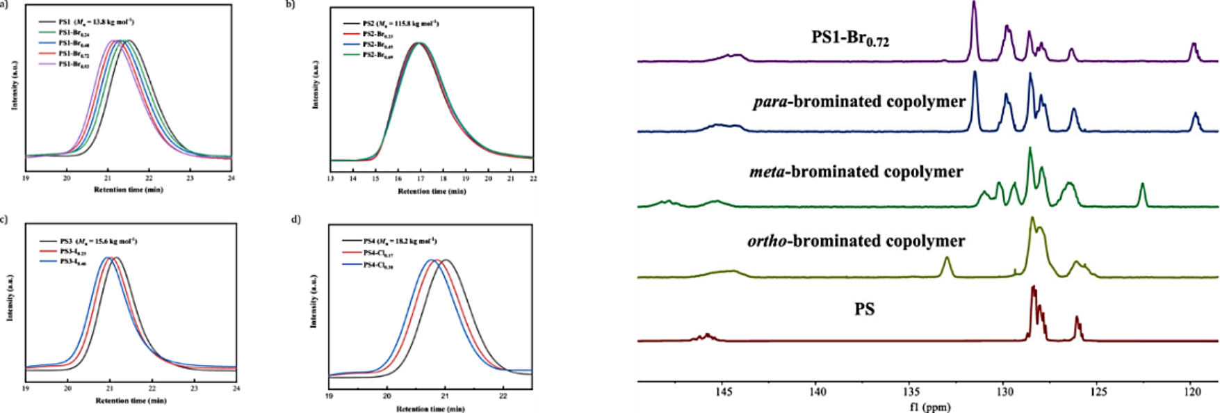 图2. 聚苯乙烯的可控卤化: 聚合物链的完整性(左)与对位选择性(右)
