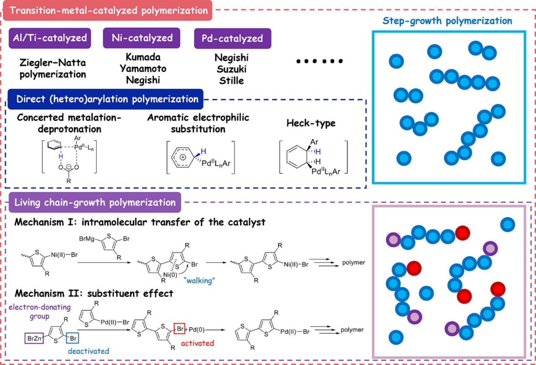 在第一部分,该综述总结了发展到目前为止高分子半导体的分子结构设计策略和合成方法。1)高分子半导体分子结构设计的两个基础是能级结构和骨架平面性。高分子半导体的能级结构影响了其光、电、热、磁等诸多性质,而高分子半导体的骨架平面性则影响其片段之间电子云的重叠程度,链间的有序堆积,最终共同影响其光电性质。2)高分子半导体的合成最初是由Ziegler−Natta催化聚合和氧化聚合等方法实现。随着上世纪80年代Ni、Pd催化偶联方法的发展,并在共轭高分子的合成中推广和使用,Stille、Suzuki等合成方法成为高分子半导体合成的主流,其高效和普适性得到了广泛的好评。该综述进一步总结了高分子半导体合成的发展新方向,重点评述了直接芳基化聚合和链增长聚合方法的成果(图3)。