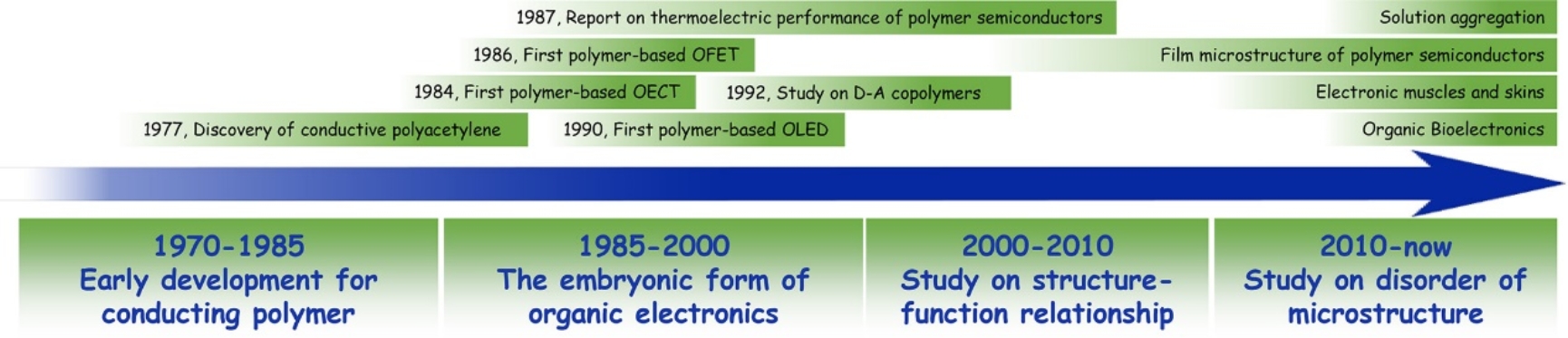 该综述首先回顾了导电和半导体高分子材料的发展历程(图2):从最初电导率超过104Scm-1的金属性导电聚乙炔的发现,到研究重心从导电高分子向高分子半导体偏移,多种不同功能的有机电子学器件涌现,并发展成为有机电子学方向;随着合成技术的发展,数量庞大的共轭高分子被合成出来,高分子半导体的结构-性能关系被逐步解析;而后,共轭高分子复杂的固相微观形貌、溶液聚集态和加工方法开始被人们重视,同时可控掺杂的进一步发展也让导电高分子焕发出新的活力。到如今,高分子半导体已经发展成为一个数量庞大、功能丰富的领域。