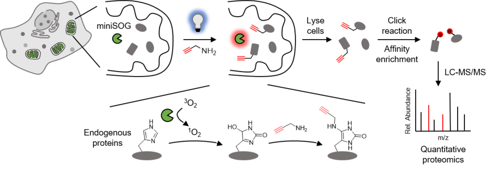 针对这些难题,邹鹏课题组开发了由可见光引发的光催化蛋白质标记与鉴定技术RinID。该方法利用可见光激发遗传靶向的蛋白质光催化剂miniSOG,由此产生的单线态氧可以对邻近蛋白质分子上的组氨酸进行氧化。于此同时,氧化产物被外源加入的小分子氨基探针原位捕获,将一个生物正交官能团共价交联到蛋白质上,进而通过亲和富集得以纯化,利用液相色谱串联质谱进行蛋白质组检测。标记的空间特异性由两方面保证,一是miniSOG能够通过遗传靶向(融合特定蛋白质或定位肽)精准定位于特定的亚细胞区域,二是单线态氧具有微秒尺度的寿命从而将标记半径局限在几十纳米的空间范围内。