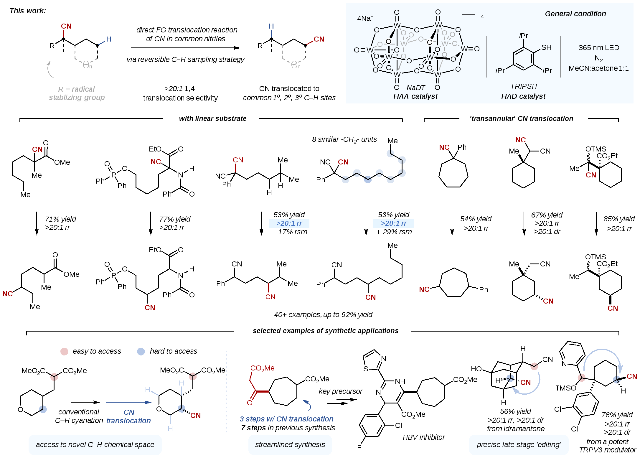 作为该课题组围绕这一新型碳氢转化策略的首篇工作,许言课题组在这项研究中成功实现了一类重要官能团——氰基——的普适性官能团直接转位反应。这一新颖转化除了将官能团移动至分子远端的一个非活化碳氢位点之外不对反应底物作任何其他改变,代表了一类此前研究较少、具有独特探索价值的反应类型。反应模式层面,这类官能团转位反应和常见的官能团转化反应构成一定互补:后者常常只改变官能团的类型而不改变官能团的位置;而前者则不改变官能团的类型,只调整其在分子中所处的位置。这类反应同时具有高原子经济性(反应前后分子式不变)和氧化还原中性特点,并具有独特的潜在合成学价值,例如有望1)提供分子骨架快速构建的新策略,2)拓展碳氢官能化可有效触及的化学空间,3)应用于天然或易得官能化骨架的后期修饰等(图2)。
