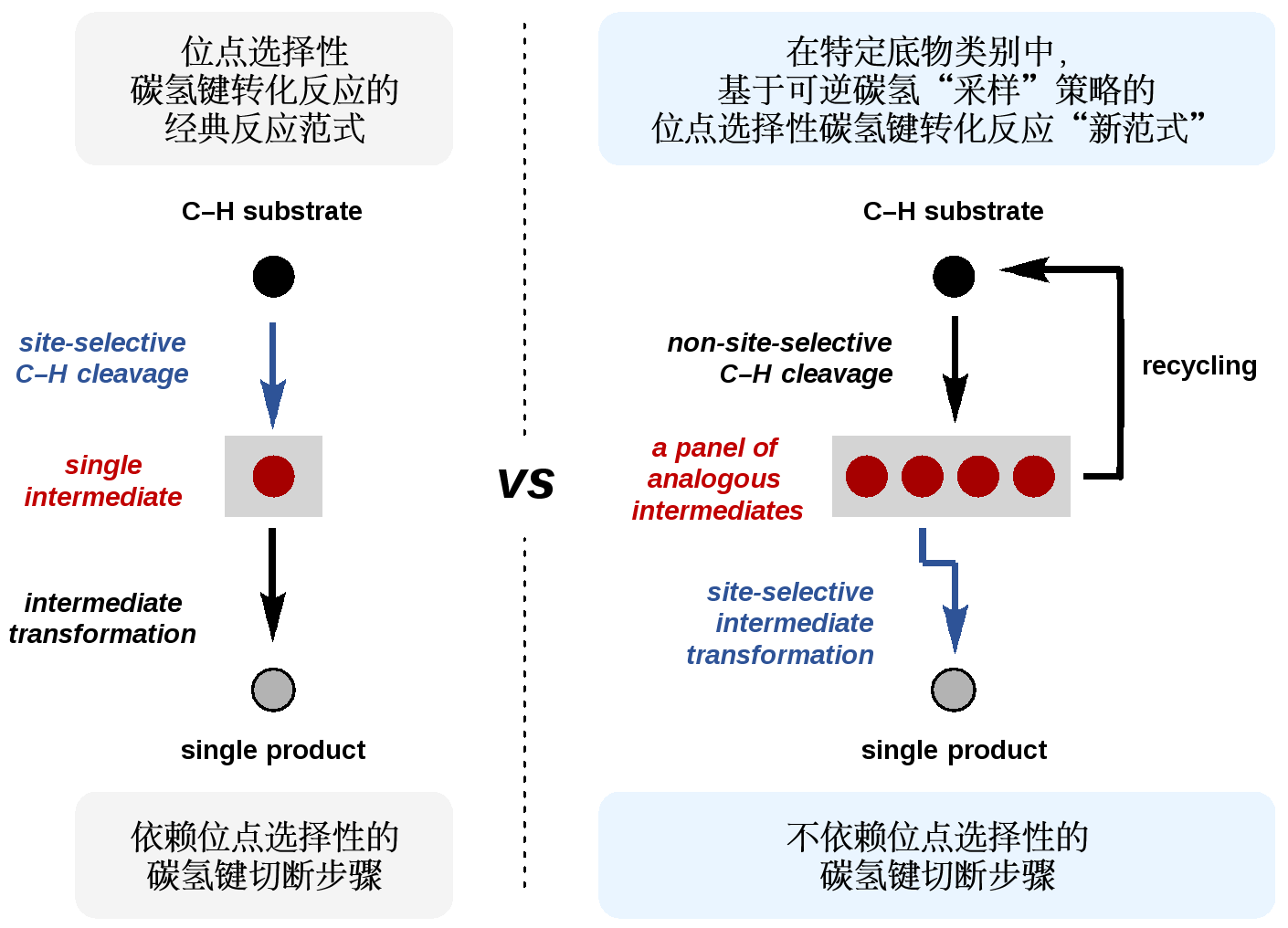 图1 |位点选择性碳氢键转化反应的经典范式与基于可逆碳氢“采样”策略的新模式的对比