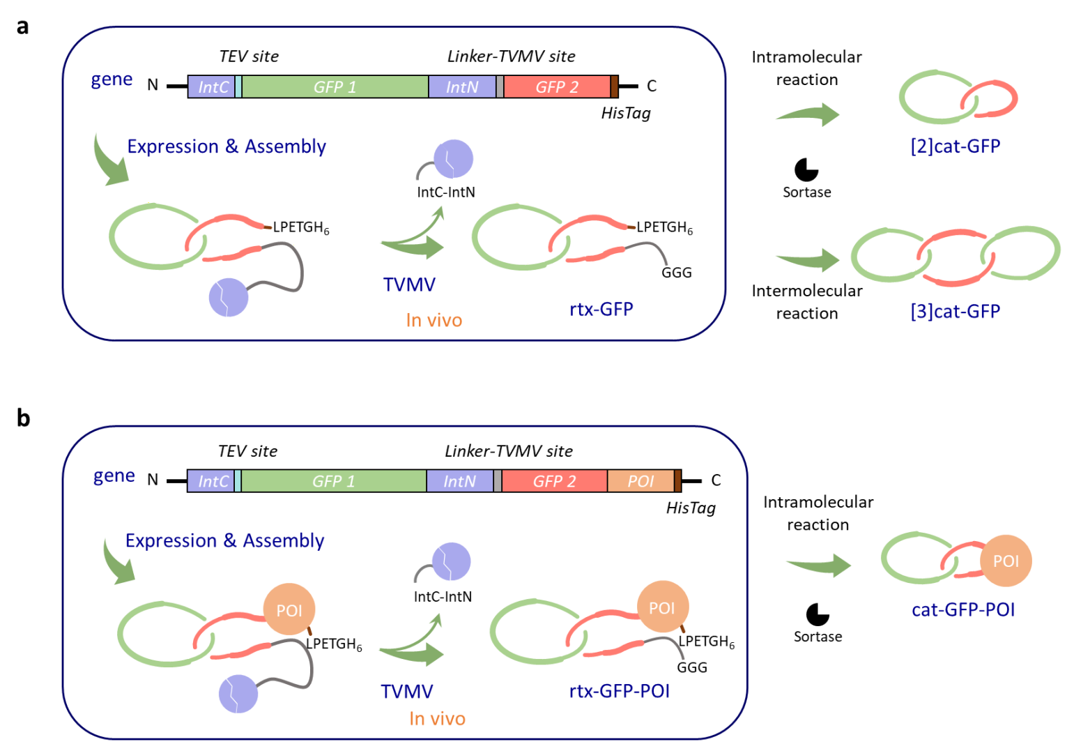 图2. a, 绿色荧光蛋白索烃的合成。b, 融合蛋白索烃的合成。