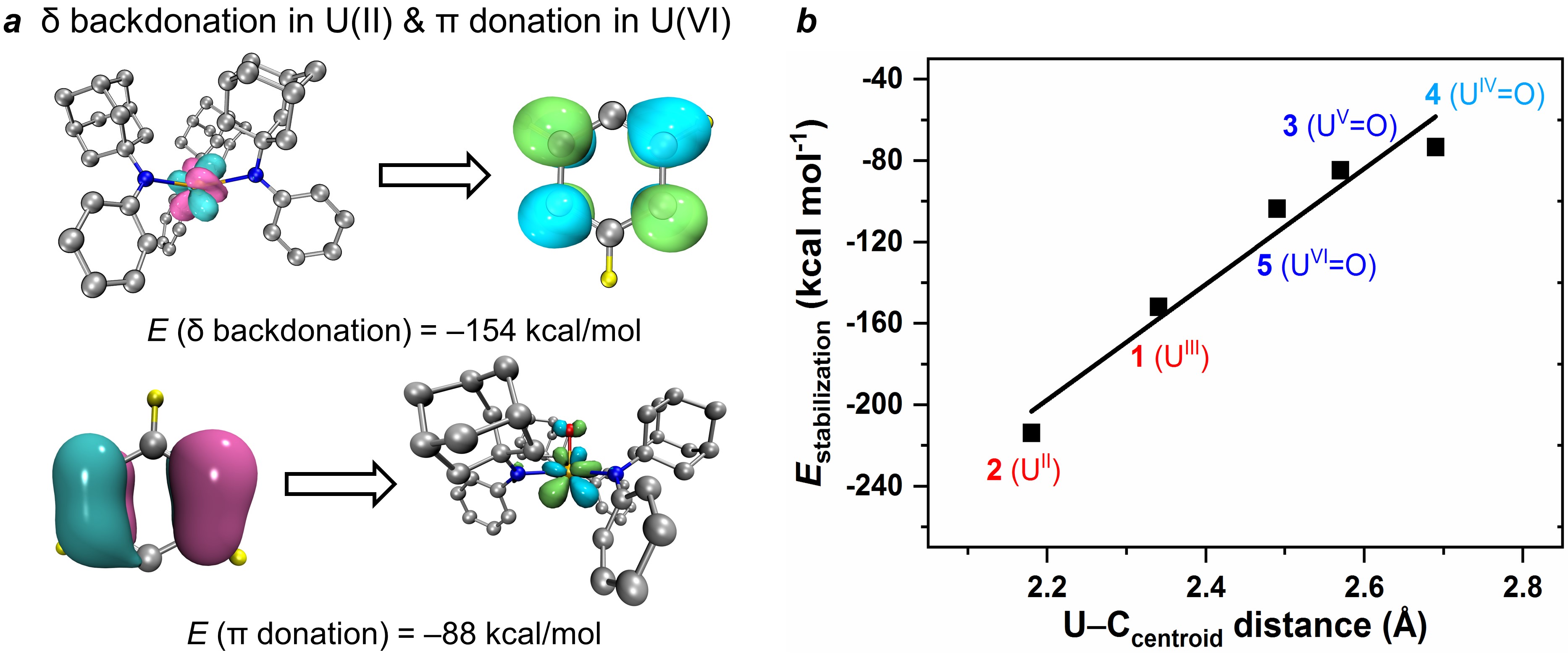 核磁共振波谱、紫外–可见–近红外吸收光谱、X射线光电子能谱、超导量子干涉仪测磁学、电子顺磁共振等表征手段确认了这些铀配合物中铀的氧化态,并为研究电子结构奠定了实验基础。密度泛函理论计算确认了铀(II)配合物具有5f4的电子组态,并揭示了铀(IV–VI)末端氧化物的铀氧多重键特征与逆反位效应。为进一步理解铀–芳烃相互作用及其对低价和高价铀的稳定作用,研究者对铀配合物进行了扩展过渡态–化学价自然轨道(ETS–NOCV)的分析。通过对配合物进行合理拆分,得到了基于不同对称性(σ/π/δ)的铀–芳烃相互作用的稳定化能,并归纳出铀–芳烃相互作用强度随铀的氧化态改变而变化的趋势。ETS–NOCV分析表明,铀的5f轨道向底座芳烃π*轨道的δ反馈作用在铀(II)和铀(III)配合物中占据主导,而底座芳烃π轨道向铀的空轨道的π配位作用则随着铀的氧化态上升而增强(图4a)。此外,铀–芳烃相互作用的稳定化能随铀的氧化态的变化趋势和铀与底座芳烃距离的变化趋势一致(图4b),确认了铀–芳烃相互作用对于稳定低价和高价铀的重要性。