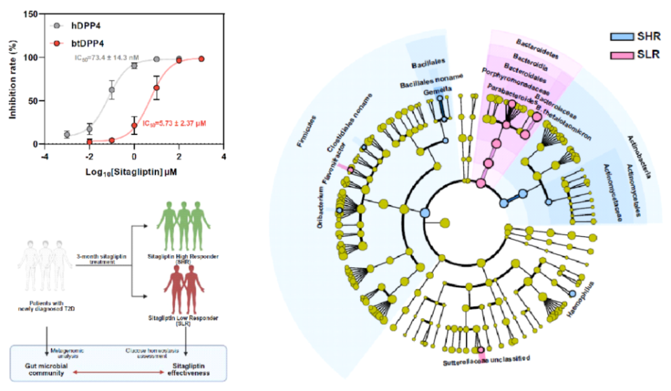 DPP4抑制剂西格列汀在临床上广泛用于2型糖尿病的治疗,是2021年全球销量第二的抗糖尿病小分子药物。然而,西格列汀的治疗效果具有较大的个体差异,临床研究发现,西格列汀对约40%的患者无法发挥有效降糖作用,其机理尚未阐明。菌源DPP4是否有可能在其中发挥了一定作用?利用酶活抑制实验及西格列汀与菌源DPP4的共结晶分析,研究人员发现目前西格列汀等针对人DPP4开发的治疗药物对菌源DPP4的抑制作用较弱。研究人员进一步招募了57名初诊2型糖尿病患者进行了为期3个月的西格列汀干预研究,与此前报道一致,不同患者对西格列汀干预的疗效具有较大的个体差异。基于多组学关联分析、菌群移植、噬菌体靶向干预实验,研究人员发现多形拟杆菌产生的btDPP4介导了西格列汀的临床响应性,为西格列汀临床响应性个体差异提供了分子机理与作用靶点。