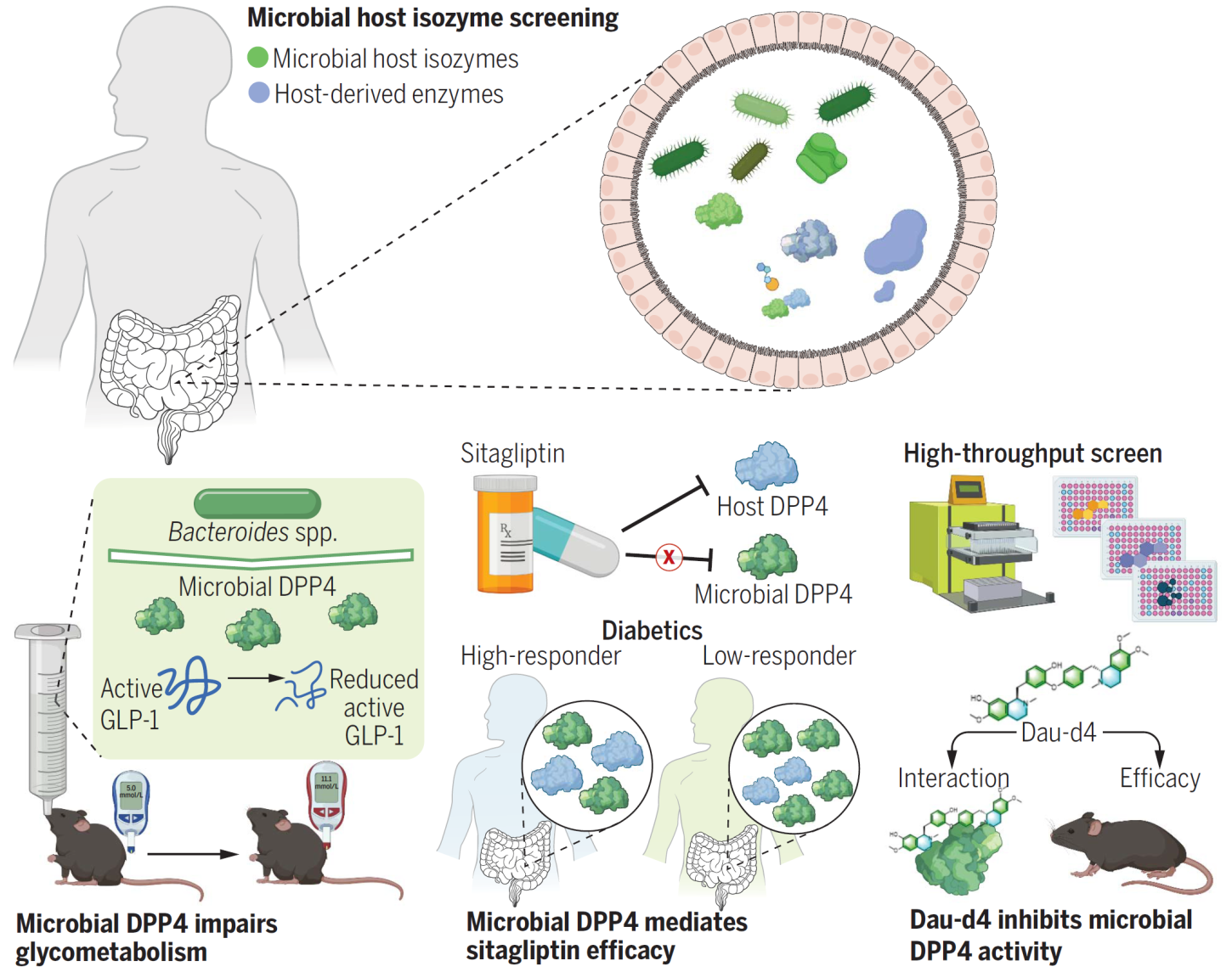 北京大学化学与分子工程学院/北大-清华生命科学联合中心雷晓光教授团队与北京大学医学部基础医学院/北京大学第三医院医学创新研究院姜长涛教授团队、北京大学第三医院/北大-清华生命科学联合中心乔杰教授团队、美国国立卫生研究院Frank Gonzalez教授团队、以及首都医科大学朝阳医院王广教授团队合作,于2023年8月4日在Science杂志在线发表了题为Microbial-host-isozyme analyses reveal microbial DPP4 as a potential antidiabetic target的研究论文,首次提出了肠道菌源宿主同工酶(Microbial-host-isozyme,MHI)新概念,发现菌源宿主同工酶在肠道中广泛存在,可以模拟宿主酶的功能,并参与疾病的发生发展。其中,菌源二肽基肽酶4(DPP4)是一种重要的同工酶,可以在肠屏障损伤条件下进入肠组织,降解宿主活性GLP-1,诱导糖耐量异常。宿主DPP4抑制剂西格列汀无法有效抑制菌源DPP4活性,是西格列汀临床治疗响应性个体差异大的重要原因。进一步,通过高通量药物筛选以及深入的功能验证,研究团队发现了首个对菌源DPP4具有高活性和强选择性的小分子抑制剂天然产物衍生物Daurisoline-d4,可以通过特异性抑制菌源DPP4,改善糖耐量异常,从而对二型糖尿病具有潜在的治疗效果。