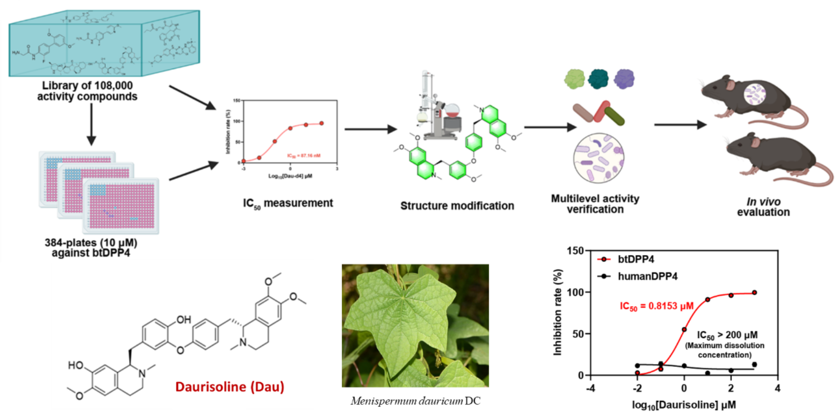 上述结果提示菌源DPP4是2型糖尿病的新型菌源治疗靶点。因此,研究人员建立了靶向菌源DPP4的高通量药物筛选体系,通过对约11万个小分子化合物的高通量药物筛选,发现了传统中药北豆根中活性成分天然产物蝙蝠葛苏林碱daurisoline (Dau) 具有最强的菌源DPP4抑制活性,而对宿主DPP4没有抑制作用。经过进一步的化合物结构改造与活性评价,研究人员确定了蝙蝠葛苏林碱的衍生物Dau-d4是一种强效高选择性的菌源DPP4抑制剂,并且通过晶体结构解析揭示了Dau-d4特异性地抑制菌源DPP4而对宿主DPP4无抑制作用的结构基础。Dau-d4可以通过抑制菌群DPP4来改善糖耐量,同时,Dau-d4对肠道共生菌的生长与组成则没有明显影响,这些结果表明,Dau-d4可以在不干扰菌群整体功能的条件下,特异性靶向菌源DPP4,有效改善小鼠糖代谢紊乱。