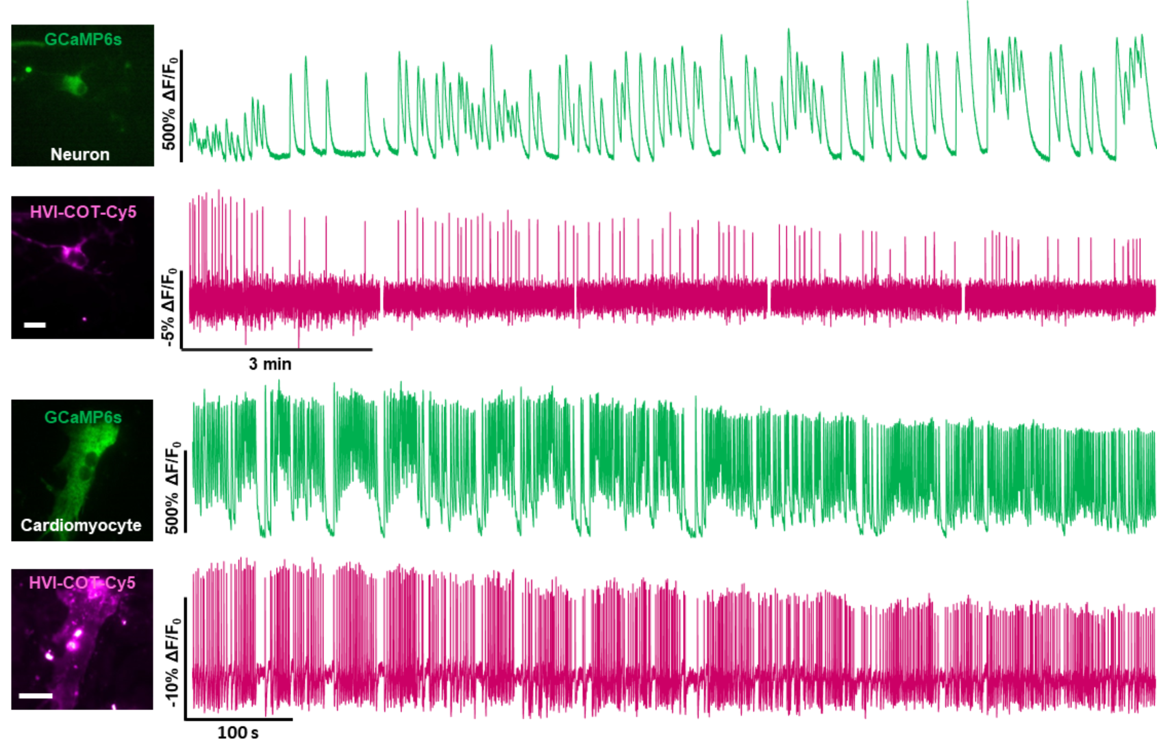 图3 利用HVI-COT-Cy5 与GCaMP6s 同步记录神经元和心肌细胞电-钙信号