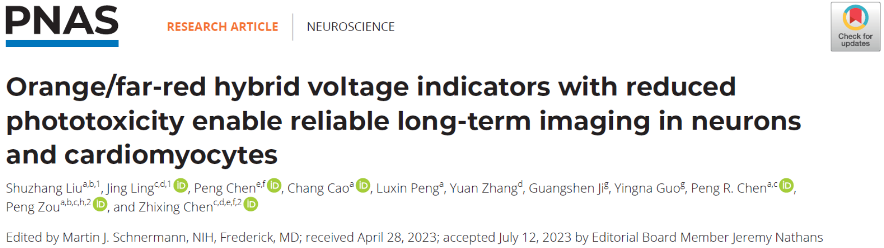 2023年8月17日,北京大学生命科学联合中心的陈知行课题组和邹鹏课题组在Proc. Natl. Acad. Sci. U.S.A.杂志在线发表了最新合作研究成果“Orange/far-red hybrid voltage indicators with reduced phototoxicity enable reliable long-term imaging in neurons and cardiomyocytes”,他们合成了光稳定性良好的环辛四烯(COT)修饰的花菁染料,搭配灵敏度优异的复合型膜电位探针HVI(hybrid voltage indicator),将其升级为新一代低光毒性探针。其中,橙色荧光探针HVI-COT-Cy3 可对神经元进行持续30min的膜电位记录,还能有效鉴定药物对神经元和心肌细胞电生理的影响;此外,远红色探针HVI-COT-Cy5可与绿色荧光探针联用,实现神经膜电位与钙信号连续15 min的并行检测。
