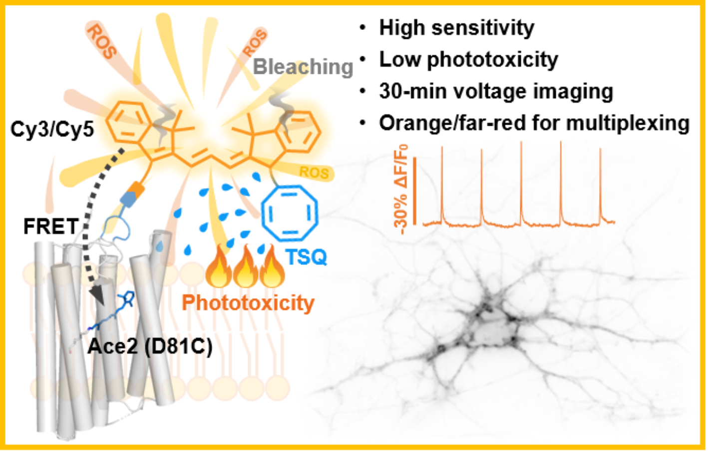 然而,荧光成像所需的激发光对活细胞存在固有光毒性,而膜电位成像为了获取足够高的信噪比,需要更高的激发光强度,相应导致更明显的光毒性和更迅速的光漂白,从而大大限制了膜电位成像的记录时长。对于神经科学研究者和药物开发者而言,无论是研究突触可塑性、动物行为节律,抑或是表征药理毒性,往往需要连续或累积进行长时间的电生理记录,这极大考验了膜电位探针的光稳定性和光毒性。