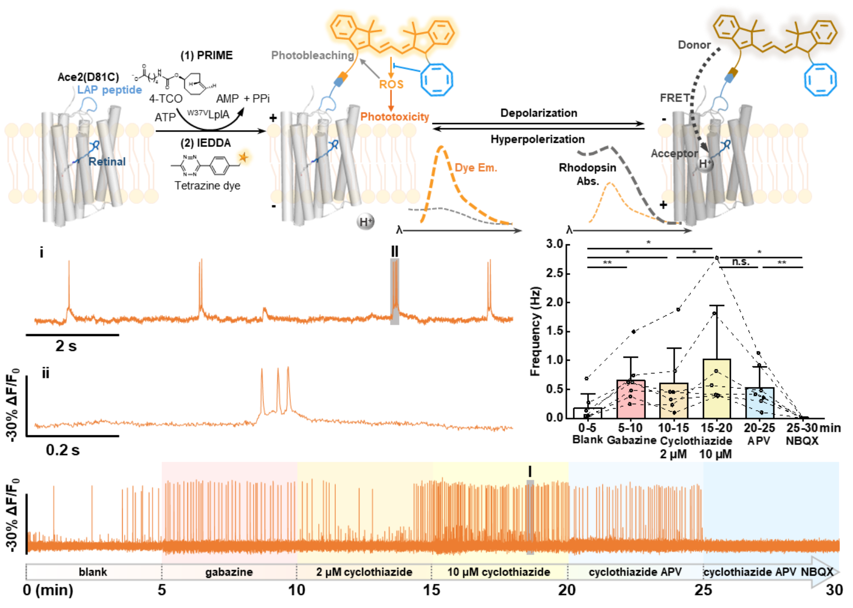 实验表明,HVI-COT-Cy3灵敏度(-33.4±0.8% ΔF/F0 per AP)超越HVI-Cy3,创下橙色波段膜电位探针灵敏度的新记录。凭借优秀的光稳定性和轻微的光毒性,HVI-COT-Cy3可对神经元连续进行30 min 的膜电位记录,并能在该时间窗口内鉴定多种药物对神经元动作电位爆发频率影响(图2)。值得一提的是,HVI-COT-Cy3的光稳定性是同类探针Voltron2525的40多倍,光毒性也明显降低。