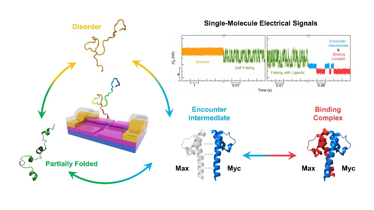 天然无序蛋白质(IDP)是一类生物体内广泛存在的没有固定结构的蛋白质,在基因转录调控等生物学过程中发挥重要作用,是潜在的药物靶标。然而,IDP高度动态的结构给研究相关的分子识别过程和药物设计带来了很大的困难。近日,北京大学化学与分子工程学院郭雪峰课题组与来鲁华课题组开展合作,采用基于硅纳米线场效应晶体管(SiNW-FET)的单分子生物传感器,成功实现了对天然无序蛋白c-Myc的单分子构象动力学的无标记、实时动态监测(图1)。这项研究成果为深入理解天然无序蛋白的特性及其与其他分子间相互作用的动态过程提供了新的研究手段。