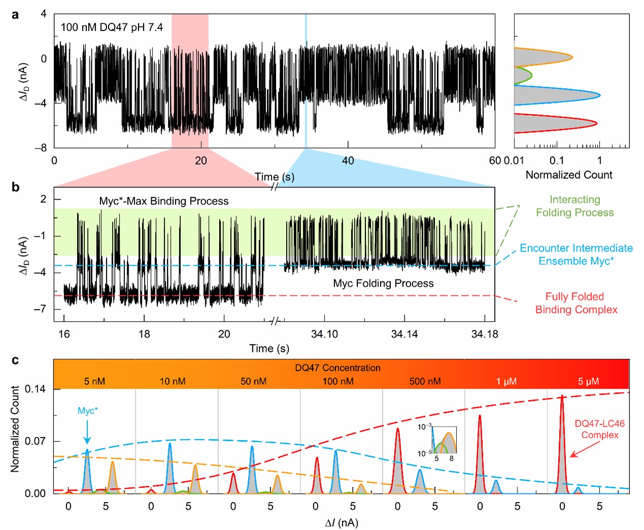 图2. Myc-Max相互作用过程的单分子电学实时监测