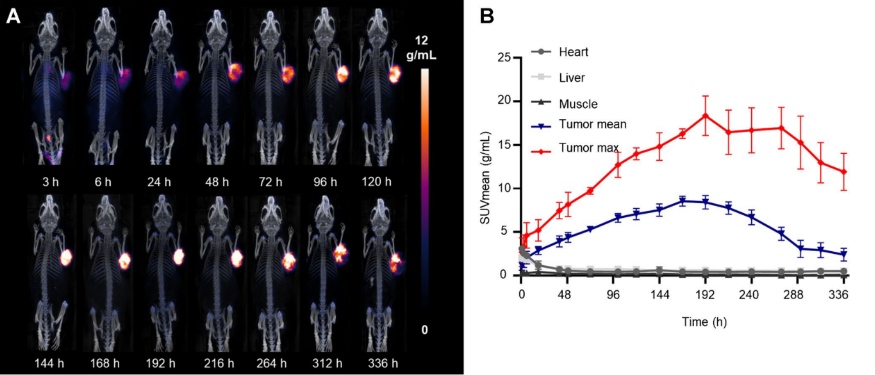 2. 抗体具有亲和力高、半衰期长、肿瘤摄取高等优点,与较长半衰期的治疗类放射性核素(如177Lu,225Ac)有较好的匹配。因此,团队筛选了FAP靶向抗体(PKU525)用于FAP靶向核素治疗。人源化PKU525可作为肿瘤特异性放射性核素载体用于FAP靶向核素治疗,[89Zr]Zr-PKU525的正电子成像(PET)显示其长达14天的肿瘤滞留时间与高度的特异性。在动物模型上,[177Lu]Lu-PKU525展现了显著的肿瘤抑制作用,且毒副作用较低,具有良好的临床转化前景6。