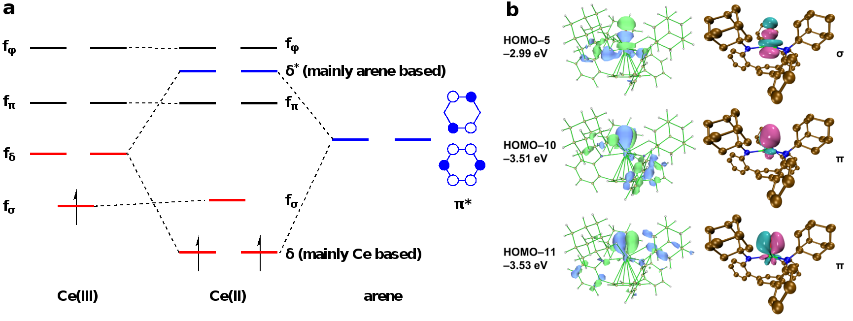 为了进一步探究K[2],K[7]和K[8]的电子结构和成键性质,作者进行了基于密度泛函理论(DFT)的计算研究。DFT计算结果显示,[2]‒的SOMO和SOMO‒1轨道为近简并的铈4f轨道和底座芳烃π*轨道的δ相互作用,且铈的4f轨道占比要高于底座芳烃2p轨道的占比。这一结果表明对二价铈配合物电子结构的最恰当表示是通过δ反馈键稳定的4f2电子构型,与文献报道的大多数非传统二价稀土离子4fn5d1的电子构型迥异。K[2]特殊的4f2电子构型与配合物结构有关:在近似C3v的配位场下,配体底座芳烃的π给电子性大幅抬高了dσ轨道的能量,而dπ和dδ轨道则参与了与配体胺基氮原子的成键,因此铈的5d轨道能量过高无法填充电子;另一方面,还原后铈与底座芳烃的距离显著缩短,在小幅抬高fσ轨道能量的同时,通过铈与底座芳烃的δ成键作用大幅降低了fδ轨道的能量(图5a)。这一系列因素最终促使二价铈离子采用4f2的电子构型。此外,作者还对四价铈的末端氧配合物K[7]和末端亚胺配合物K[8]的铈‒氧和铈‒氮多重键性质进行了自然局域分子轨道(NLMO)的分析。分析表明,在铈‒氧三重键中,两个近简并的π键能量显著低于σ键,这在多重键中并不常见,之前仅见于铀酰等少数例子中,凸显了铈‒氧多重键的强度。与之相反,在铈‒氮多重键中,σ键能量远低于π键,而且计算得到的Wiberg键级1.23也显著低于铈‒氧键的1.58。