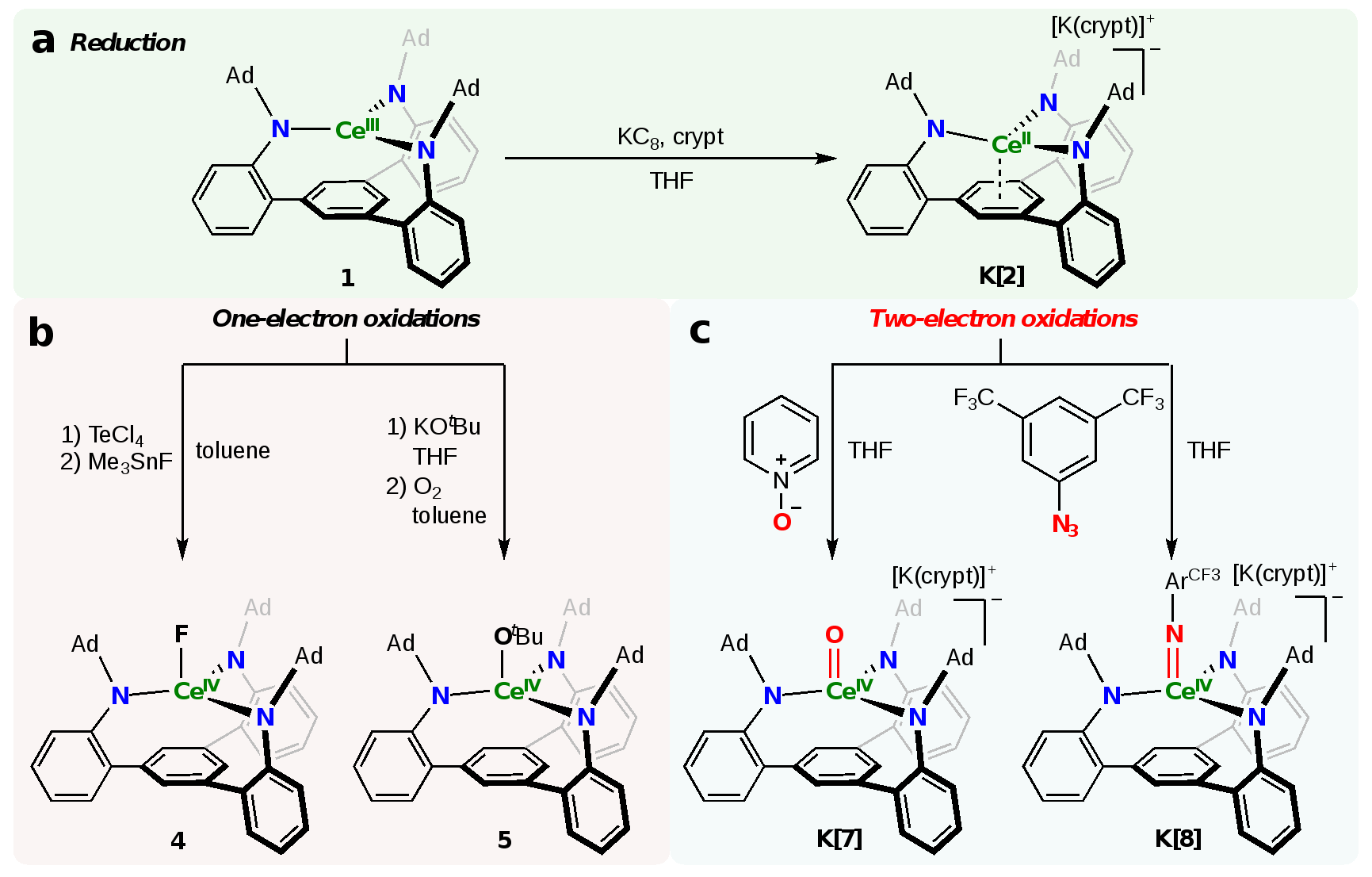 从配体钾盐K3(AdTPBN3)和三价铈前驱体CeX3(THF)4 (X = Br or I)出发,通过盐复分解反应可得三价铈的配合物(AdTPBN3)Ce(III) (1)。电化学测试结果显示,1在‒2.68 V (vs. Fc+/Fc)处有一个可逆的还原峰,而在‒0.26 V (vs. Fc+/Fc)则有一个不可逆的氧化峰,表明1的化学还原和氧化是可行的。用KC8/crypt(穴醚222)还原1可以得到二价铈的配合物[K(crypt)][(AdTPBN3)Ce(II)] (K[2])(图3a)。核磁氢谱显示,2中底座芳烃的氢位于极高场‒178 ppm,表明铈与底座芳烃存在较强的轨道相互作用。尽管1与一些常用氧化剂无法得到明确的结果,但利用TeCl4氧化后再加Me3SnF处理的方法,可以得到稳定的四价铈的氟化物(AdTPBN3)Ce(IV)F (4);此外,1与KOtBu反应后再通入氧气可以得到四价铈的叔丁氧配合物(AdTPBN3)Ce(IV)OtBu (5)(图3b)。这些结果表明(AdTPBN3)能够稳定铈的三种氧化态(+2到+4价),为进一步尝试从二价铈到四价铈的直接两电子氧化打下了基础。K[2]与吡啶氧化物或3,5-双(三氟甲基)苯基叠氮(N3ArCF3)反应,能够得到四价铈的末端氧配合物(AdTPBN3)Ce(IV)O (K[7])或末端亚胺配合物(AdTPBN3)Ce(IV)NArCF3 (K[8])(图3c)。这是首个稀土元素的单中心两电子氧化反应。