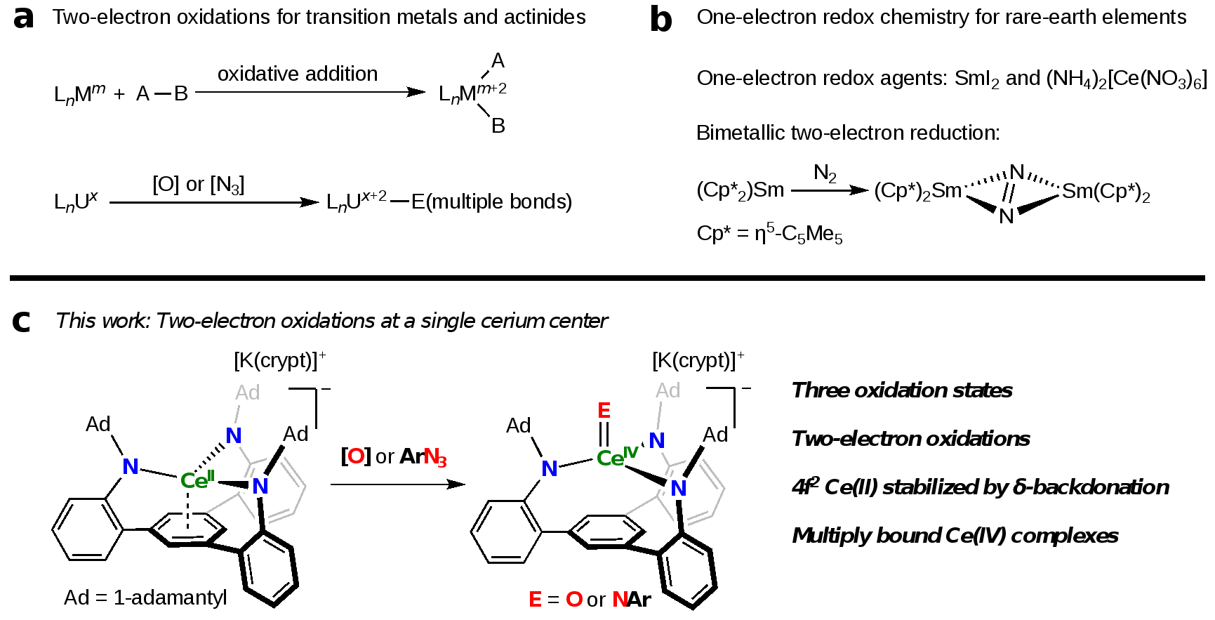 两电子氧化在合成和催化中无处不在,并起着举足轻重的作用。对于过渡金属和锕系元素来说,两电子氧化常发生在单个金属中心,如氧化加成反应和氧原子转移反应等(图1a)。然而,由于缺乏可变氧化态,稀土元素的氧化反应局限于单电子过程,如常用的单电子还原剂SmI2和单电子氧化剂(NH4)2[Ce(NO3)6],而两电子过程则需要两个或以上金属中心的参与(图1b)。近年来,稀土元素非寻常氧化态化学的发展为实现单一稀土元素中心的两电子过程提供了可能。但是,非正三价稀土离子的不稳定性以及不同价态稀土离子间的巨大差异阻碍了这一目标的实现。近日,北京大学化学与分子工程学院黄闻亮课题组利用三脚架型三胺基芳烃配体成功稳定了铈的三种氧化态(+2到+4价),并首次实现了从Ce(II)到Ce(IV)的两电子氧化(图1c)。该成果以“Two-electron oxidations at a single cerium center”为题,于2023年9月22日在《美国化学会志》(Journal of the American Chemical Society)上在线发表,并被选为封面文章。