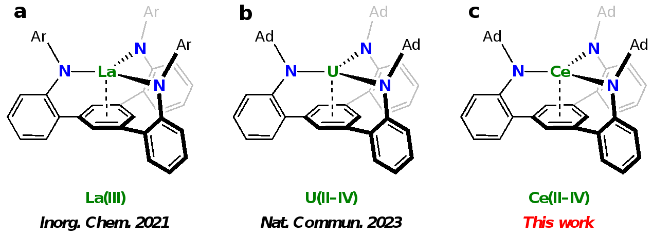 该课题组近年来基于“f区金属–芳烃协同作用”的概念,发展了一类三脚架型三胺基芳烃配体并将其引入f区金属配位化学(图2a)。最近,利用金刚烷基取代的配体((AdTPBN3)3‒)来稳定铀的五种氧化态(+2到+6价),并证实了底座芳环能够起到同时稳定低价和高价铀离子的作用(图2b)。在此工作中,作者利用该配体稳定铈的三种氧化态,+2到+4价,并首次实现了从Ce(II)到Ce(IV)的两电子氧化反应(图2c)。