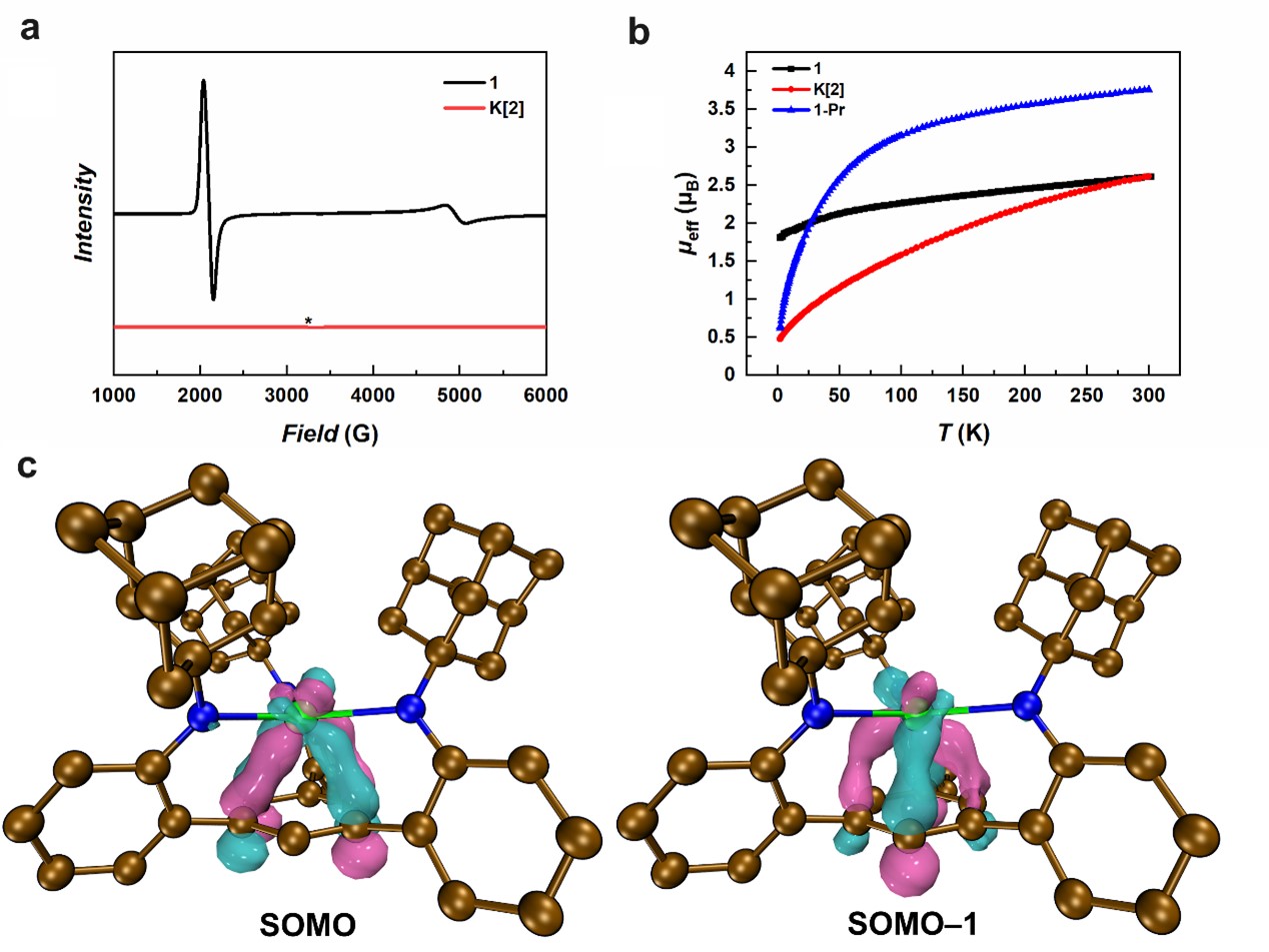图4:二价铈配合物K[2]的电子结构:a1和K[2]的固体样品在10 K下的EPR谱;b1,K[2]和1-Pr在1kOe条件下的变温磁化率数据;c K[2]的SOMO和SOMO‒1轨道
