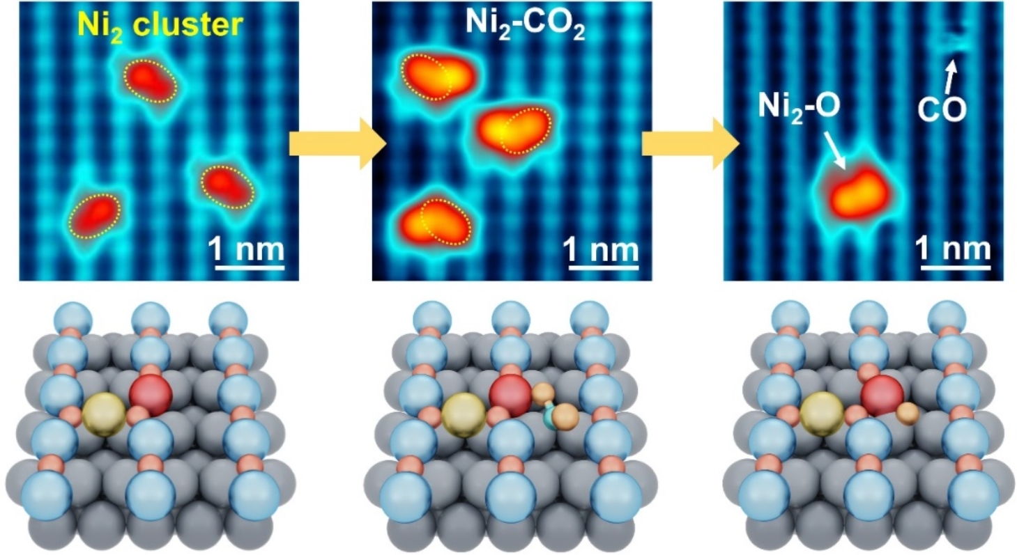 图1. 单原子层CuO上Ni2单团簇表面CO2低温解离过程的STM成像研究