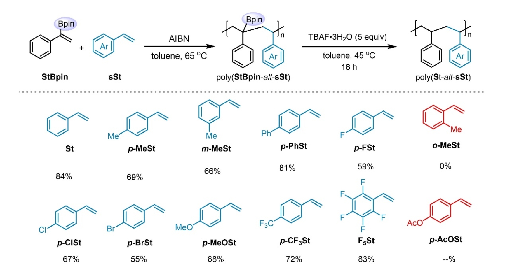 图1. Bpin作为无痕控制基团合成(苯乙烯/取代苯乙烯)交替共聚物