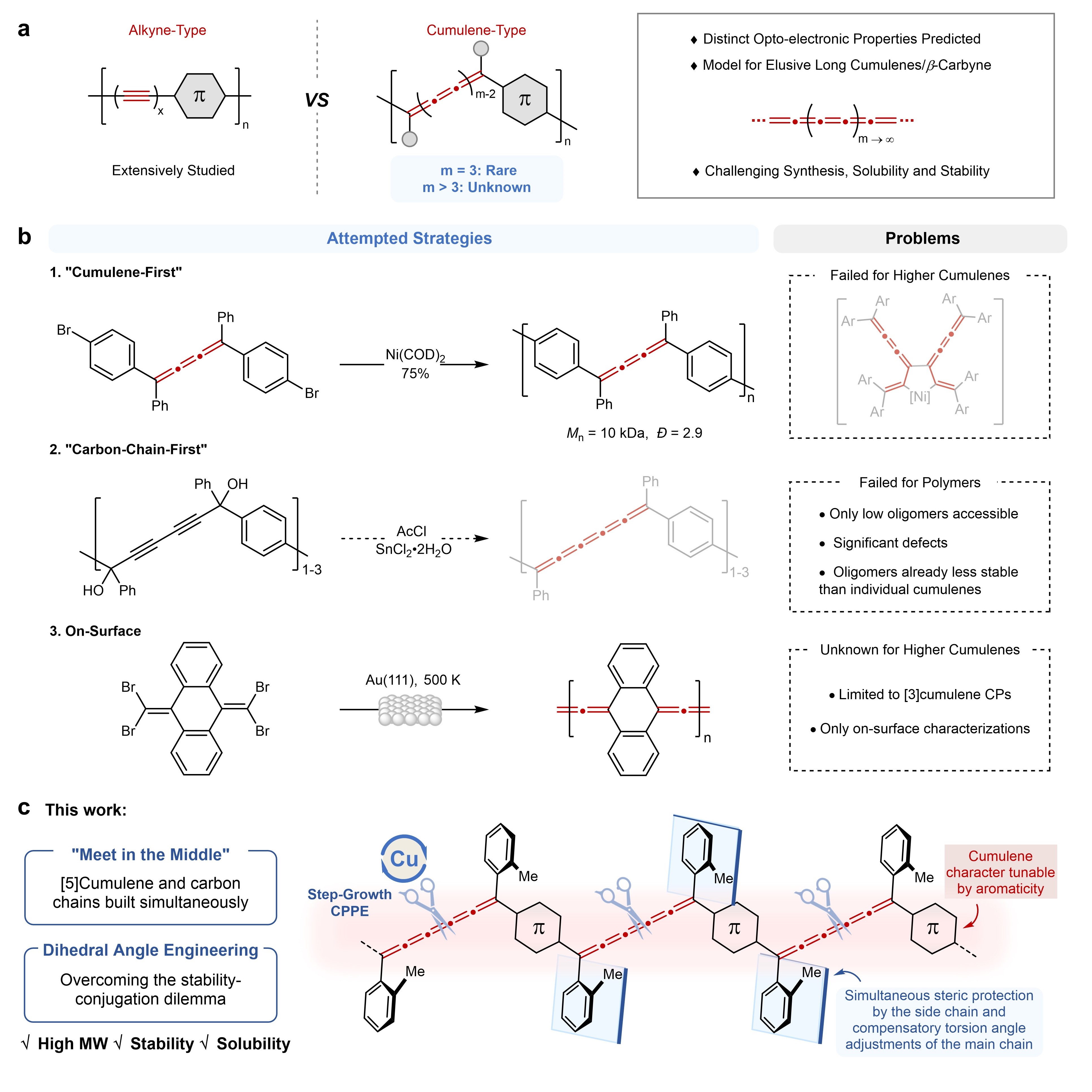sp杂化碳链在基态下存在“多炔”和“累积多烯”两种形式(图 1a),其中炔基共轭高分子已经得到深入研究,而累积多烯型却鲜有报道。后者不仅被预测具有独特的光电性质,还有望作为模型分子用于研究“卡拜”。然而,受限于其高度不稳定性和低溶解度,人们至今最多仅合成了含有三个累积双键的共轭高分子(图 1b)。如何将更长的累积烯烃引入共轭聚合物骨架,仍是悬而未决的挑战。