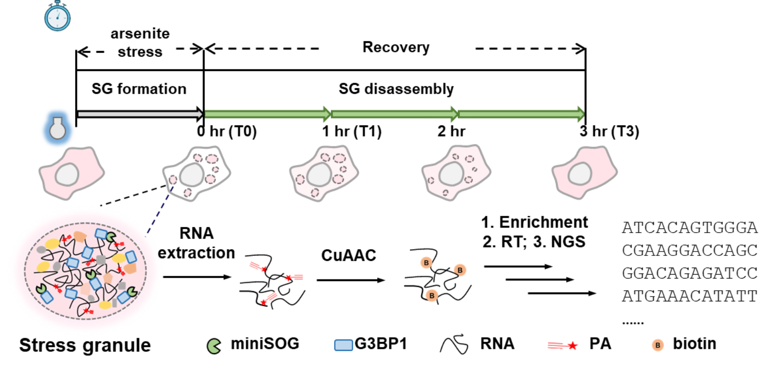 应激颗粒是在胁迫条件下形成的动态结构,通常认为其中包含翻译被抑制的RNA以及翻译元件,并可在刺激消失后解聚,是细胞内典型的无膜细胞器。在应激颗粒组装的不同阶段,大量RNA分子会被招募至应激颗粒中,对维持应激颗粒结构的稳定和刺激下通过调节基因表达来影响细胞生存等方面发挥重要作用。近年来,关于应激颗粒中的RNA成分问题已经开展了大量的研究。例如,基于成像的技术能够直接观测不同转录本在应激颗粒中的定位,以及可以实现在活细胞中监测转录本在不同颗粒之间的交换与翻译状态。然而,成像技术受限于较低的通量,并且需要已知的序列信息设计引物或构建报告分子,难以对应激颗粒中的RNA组成进行全局研究。另外,基于抗体的亲和沉淀分离应激颗粒并结合高通量测序技术能够提供应激颗粒的转录组信息。在实际操作中,复杂的分离纯化步骤很容易造成组分丢失或引入污染,从而导致转录组数据含有较高的假阴性与假阳性。同时,这种分离方法无法应用于研究应激颗粒的组装与解聚动态过程。目前关于应激颗粒的RNA组成及其动态过程下的RNA组成变化的研究仍然有限。