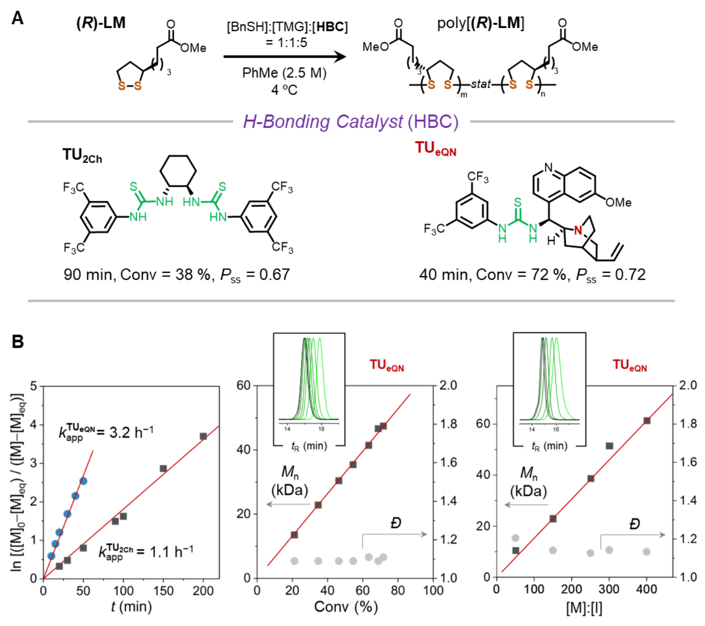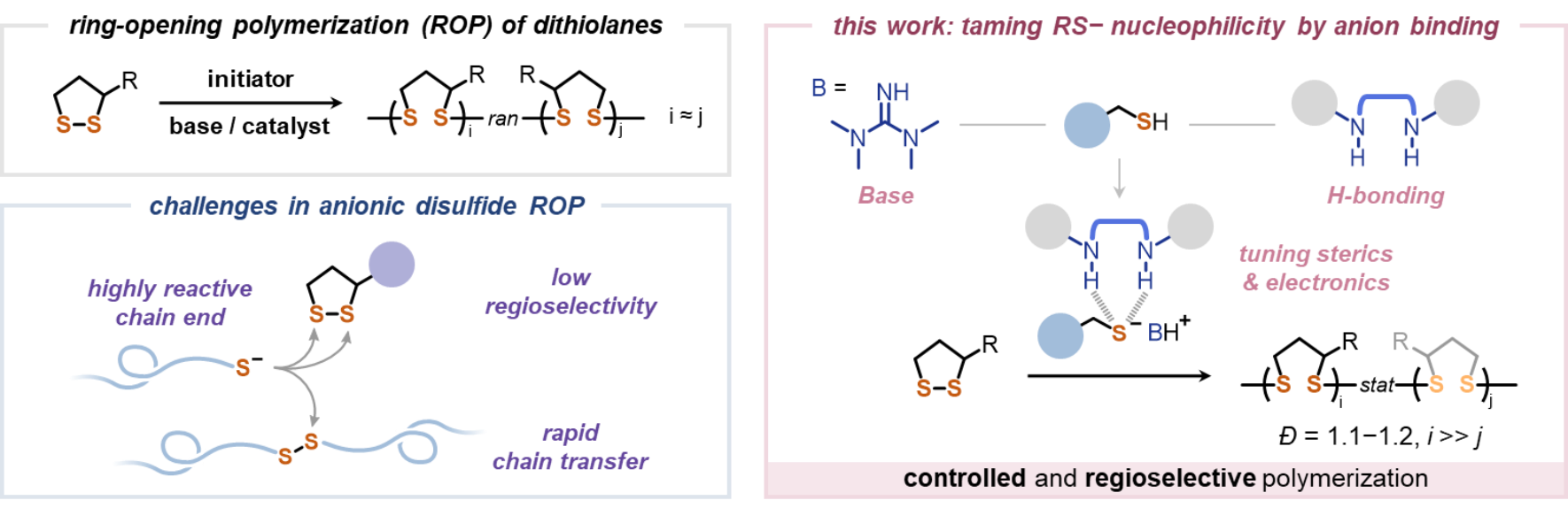近日,北京大学化学与分子工程学院刘允课题组发展了一种“阴离子结合催化”策略,利用基于硫脲的氢键催化剂与四甲基胍这一组合催化体系实现了硫辛酸衍生物的可控、高区域选择性的开环聚合反应,得到了低分散度(1.1–1.2)和高区域规整度(头尾相连占比>85%)的聚二硫化物(图1)。
