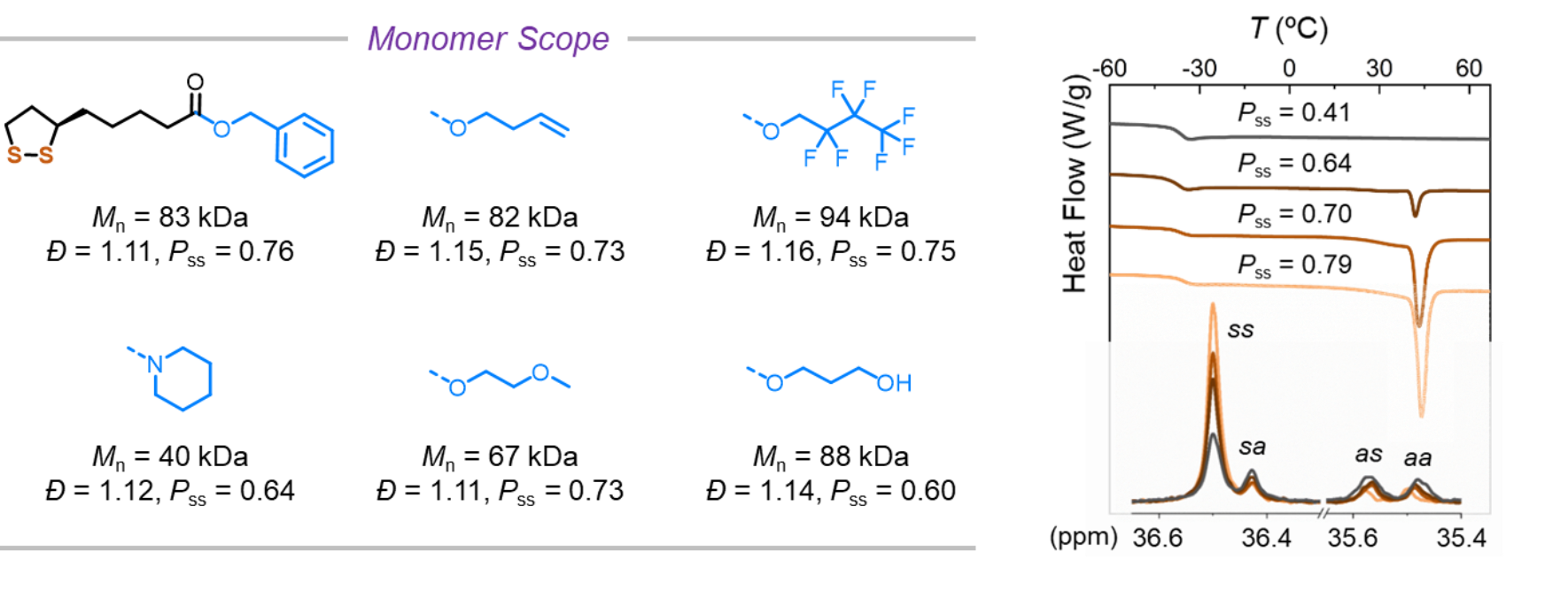 图3 可控聚合的实例(左);聚(R-硫辛酸甲酯)在45 ºC的结晶峰随区域规整度(Pss)增加而升高(右)。