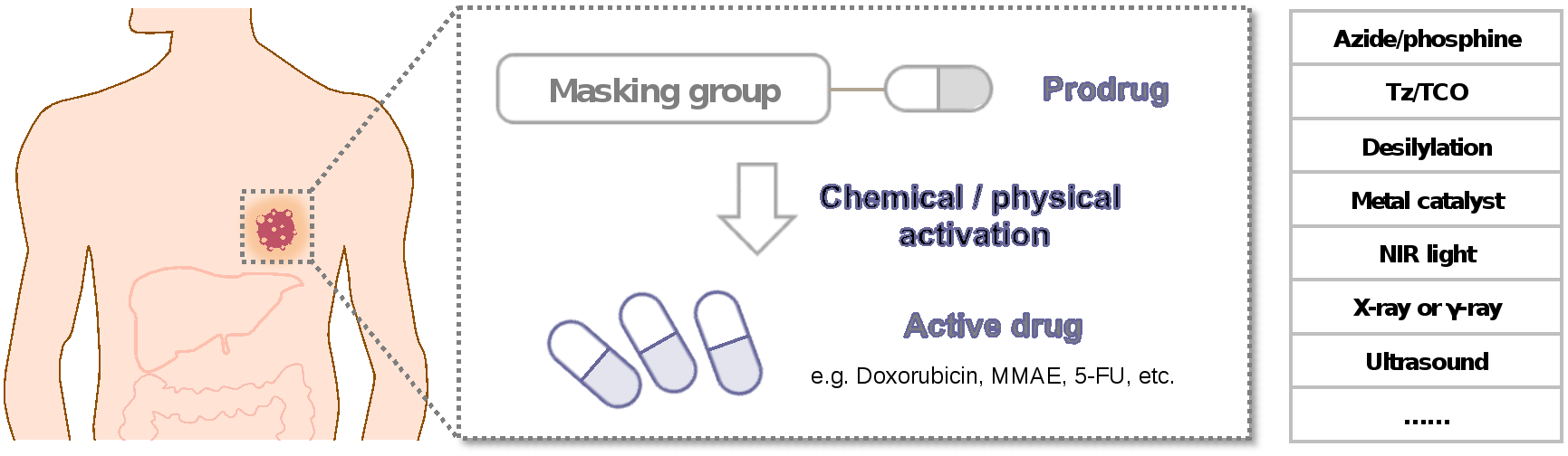 如何使用化学工具应对肿瘤治疗的难题,是生物正交反应领域研究的重要方向之一。传统的肿瘤治疗药物常常伴随严重的副作用,前药策略是解决上述问题的常用手段。前药本身不具有药物活性,受到刺激时在肿瘤部位转化为活性药物,从而降低药物的副作用,同时保留治疗效果。目前,临床上批准的前药通常利用酶或微肿瘤微环境的化学刺激进行激活,然而该内源性的化学激活手段可能导致药物的脱靶毒性。相比之下,外源刺激响应的前药有望解决该难题,生物正交反应是构建外源刺激响应前药的关键。