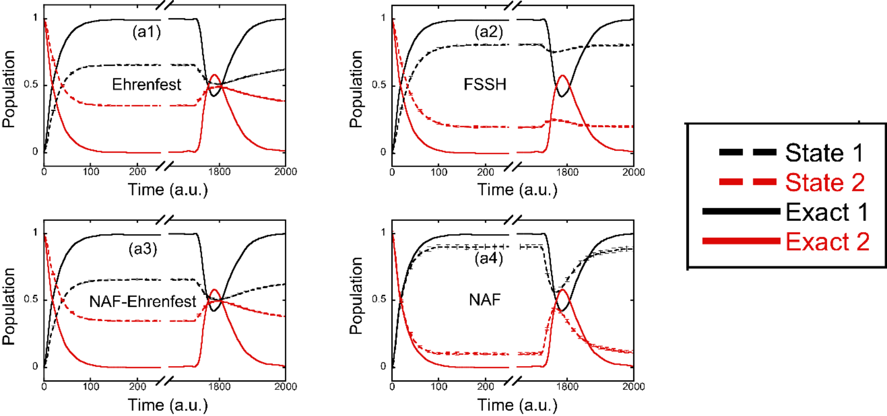 图5. 两态腔中原子模型的布居数动力学模拟结果。黑色和红色分别表示原子的基态和激发态布居数,实线和虚线分别表示量子力学的严格结果和轨线方法的模拟结果。(a1): Ehrenfest动力学的结果;(a2): 面跳跃方法的结果;(a3): NAF结合Ehrenfest动力学的结果;(a4): NAF结合量子相空间的结果。