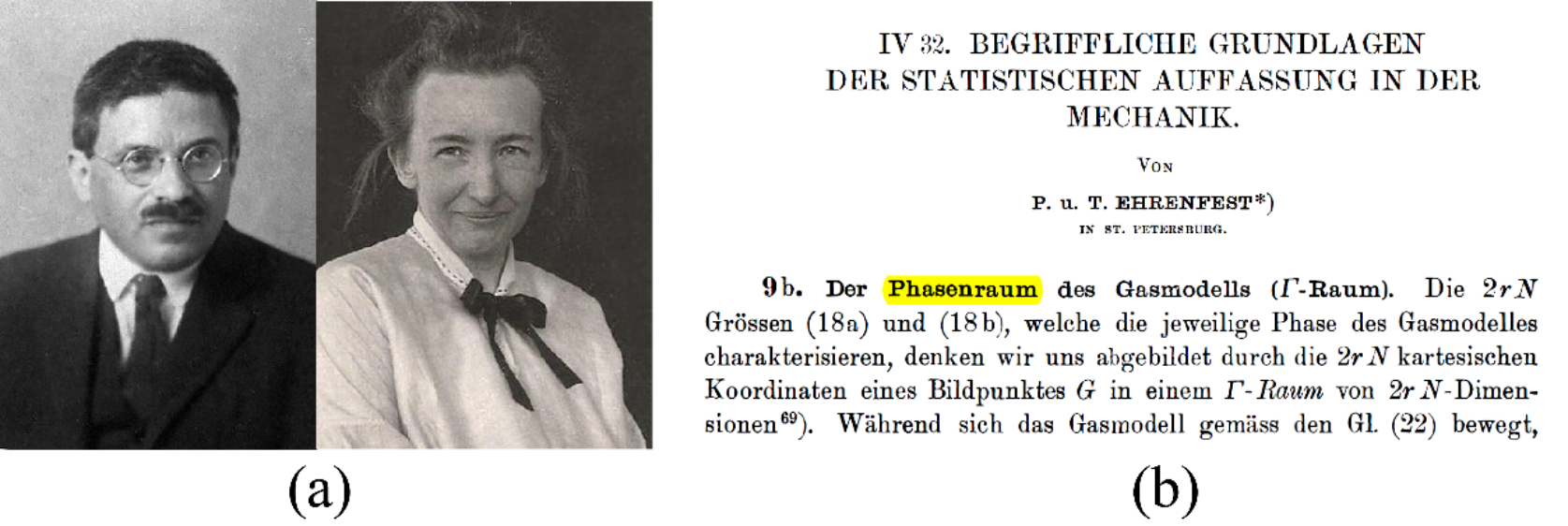 图1. (a): Paul Ehrenfest和Tatyana Ehrenfest夫妇(图片来源:Wikipedia);(b): Ehrenfest夫妇提出相空间的原始文章(Ehrenfest;, P.; Ehrenfest, T. Begriffliche Grundlagen Der Statistischen Auffassung in Der Mechanik. In Encyklopädie Der Mathematischen Wissenschafte, B. G. Teubner: Liepzig,Germany, 1911; Vol. 4, pp 1-90)。