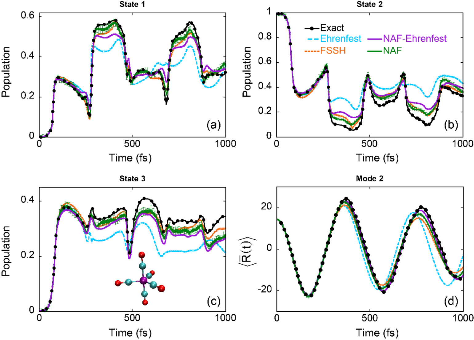 图6. Cr(CO)5分子锥形交叉模型的模拟结果。(a)-(c): 各电子态的电子布居数随时间的变化;(d): 原子核位置随时间的变化。黑色点线:量子力学的严格结果;青色虚线:Ehrenfest动力学的结果;橙色虚线:面跳跃方法的结果;紫色实线:NAF结合Ehrenfest动力学的结果;绿色实线:NAF结合量子相空间的结果。