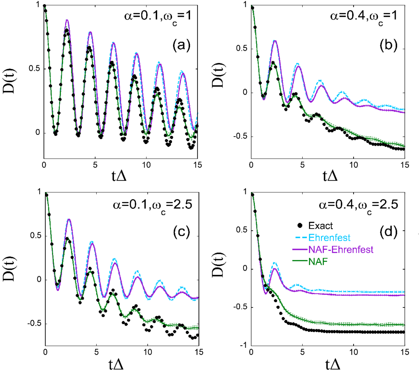 图3. Ohmic谱密度自旋玻色模型在低温(β=5)下两态布居数之差随时间变化的模拟结果。其中两态间的耦合为Δ=1,Kondo参数α和截断频率ωc分别为(a): α=0.1, ωc=1; (b): α=0.4, ωc=1; (c): α=0.1, ωc=2.5; (d): α=0.4, ωc=2.5。黑色圆点:量子力学的严格结果;青色虚线:Ehrenfest动力学的结果;紫色实线:NAF结合Ehrenfest动力学的结果;绿色实线:NAF结合量子相空间的结果。