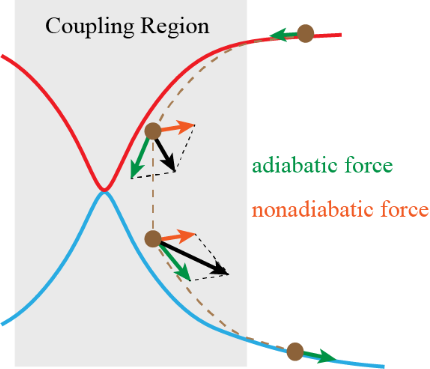 在这篇展望文章中,刘剑课题组提出了一种概念新颖的轨线动力学形式—非绝热场(nonadiabatic field, NAF)。这种动力学新方法把原子核的受力分为两部分,一部分为单一电子态势能面提供的力(称为绝热力),另一部分来自于非绝热耦合场贡献的部分(称为非绝热力)。NAF的提出旨在能够全面获取非绝热分子动力学中耦合区域和渐近区域的重要特征:在非绝热区域,原子核在单态势能面上运动的同时可以感受到电子相干反馈的非绝热力的贡献,使得NAF对体系在非绝热区域演化的描述更为准确。而当体系演化离开非绝热区域后,由于非绝热耦合自然消失,使得非绝热力的贡献也消失,NAF动力学自然退化为Born-Oppenheimer动力学形式,使得渐进区域原子核运动的分支效应得到合理描述。