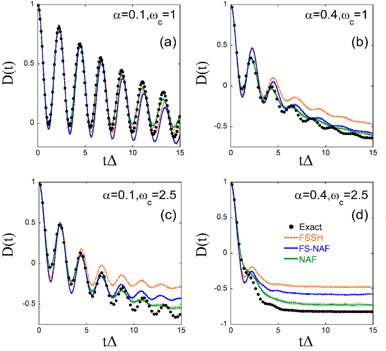 图4. Ohmic谱密度自旋玻色模型在低温(β=5)下两态布居数之差随时间变化的模拟结果。其中两态间的耦合为Δ=1,Kondo参数α和截断频率ωc分别为(a): α=0.1, ωc=1; (b): α=0.4, ωc=1; (c): α=0.1, ωc=2.5; (d): α=0.4, ωc=2.5。黑色圆点:量子力学的严格结果;橙色虚线:面跳跃方法的结果;蓝色实线:NAF结合面跳跃方法的结果;绿色实线:NAF结合量子相空间的结果。