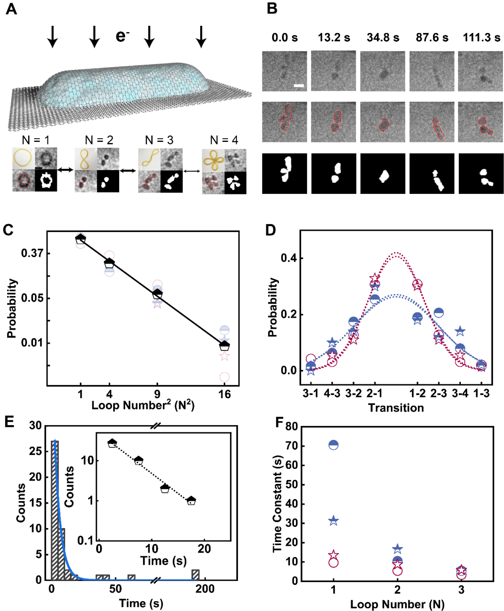 图1:A:环状DNA构象态;B:构象态实时转化的液相电镜图;C:构象态概率分布和环数平方的关系,D. 构象态转化概率和分布。