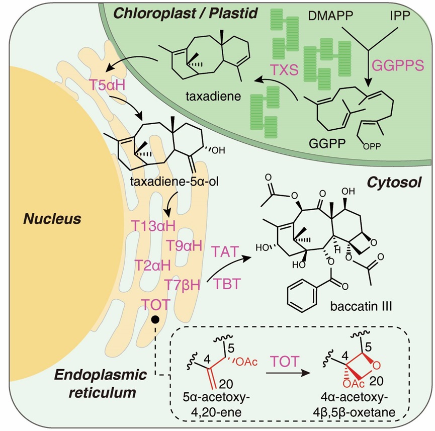 随着生物技术的快速发展,基于合成生物学的异源合成策略已发展成为解决复杂植物天然产物高效制备的有力手段,因此通过合成生物学的手段实现紫杉醇的高效、绿色和可持续生产受到了广泛的关注。然而,要实现紫杉醇在异源体系中的从头合成,必须要鉴定紫杉醇生物合成通路中所缺失的关键酶,打通紫杉醇完整的生物合成途径。