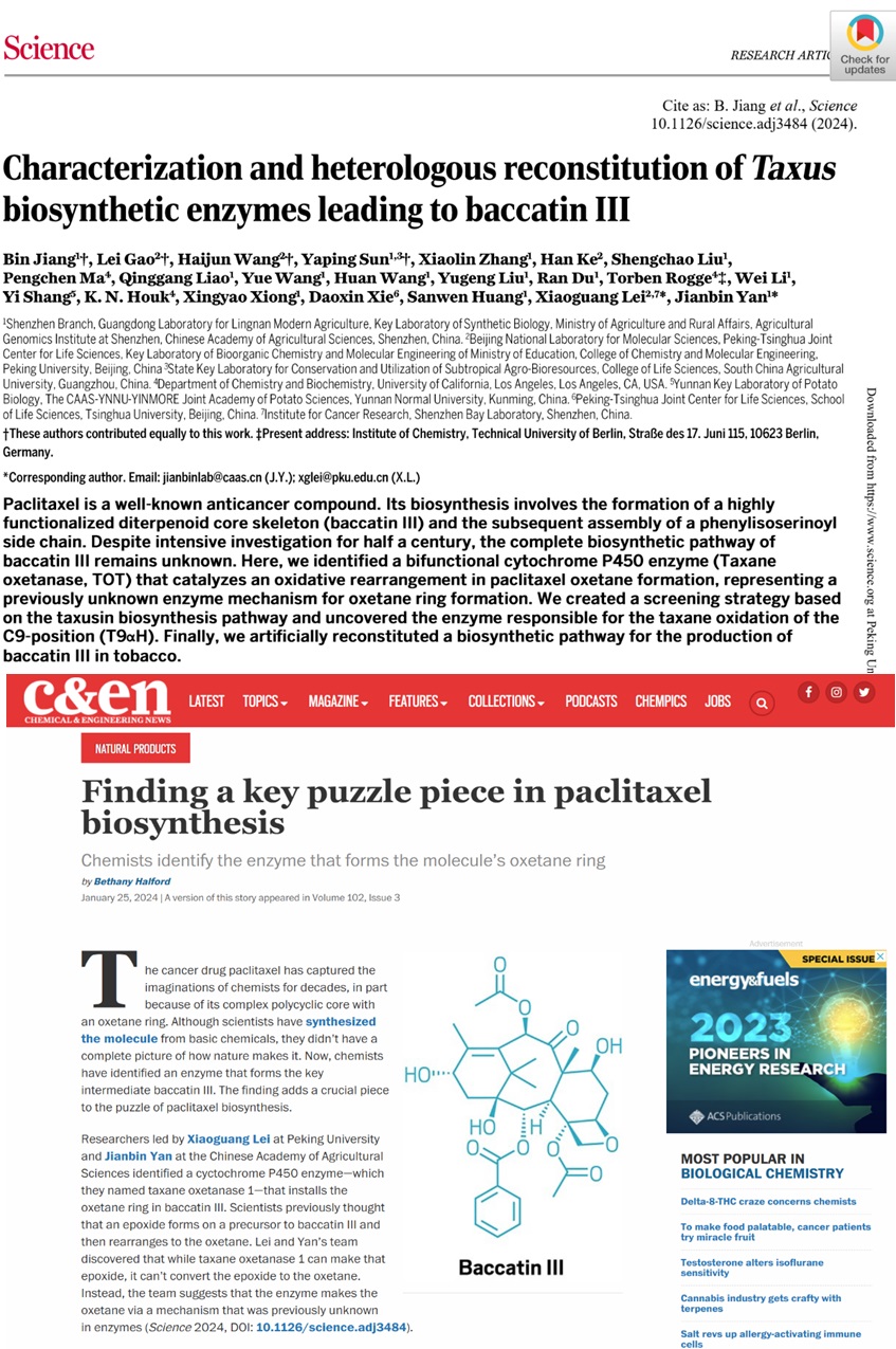 该工作以“Characterization and heterologous reconstitution of Taxus biosynthetic enzymes leading to baccatin III”为题发表在国际权威期刊《Science》上(Science2024, DOI: 10.1126/science.adj3484)。半个世纪以来,紫杉醇生物合成领域的前期科研突破主要由欧美国家的科学家主导完成,但是最终中国科学家破解了长期以来紫杉醇生物合成途径的“卡脖子”难题,鉴定了最具挑战的未知合成酶,实现了紫杉醇关键生产前体合成路线的人工重构。该工作发表后,美国化学会官方杂志-化学化工新闻周刊《C&E News》第一时间以“Finding a key puzzle piece in paclitaxel biosynthesis”为标题将该工作作为重要科学突破进行了专题新闻报道。