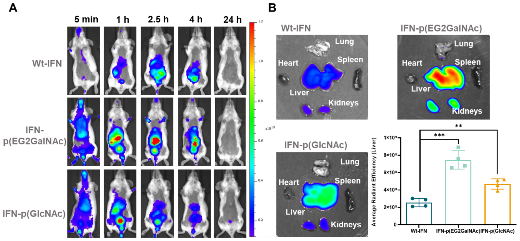 作者进一步将GalNAc功能化的蛋白-PDS偶联物注射入小鼠体内,荧光成像实验表明该偶联物会迅速在肝脏中积累,在2.5 h后达到峰值(图3),证明了这种偶联物的活体肝脏靶向能力。